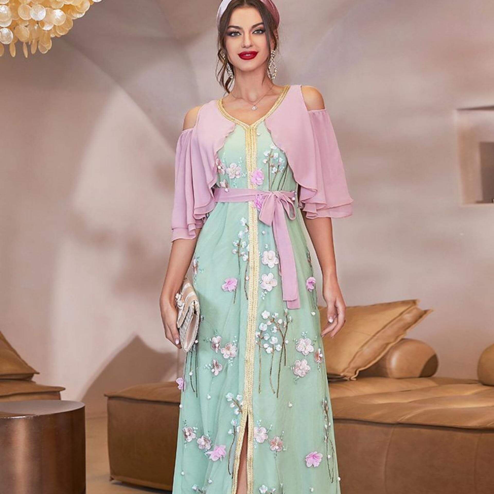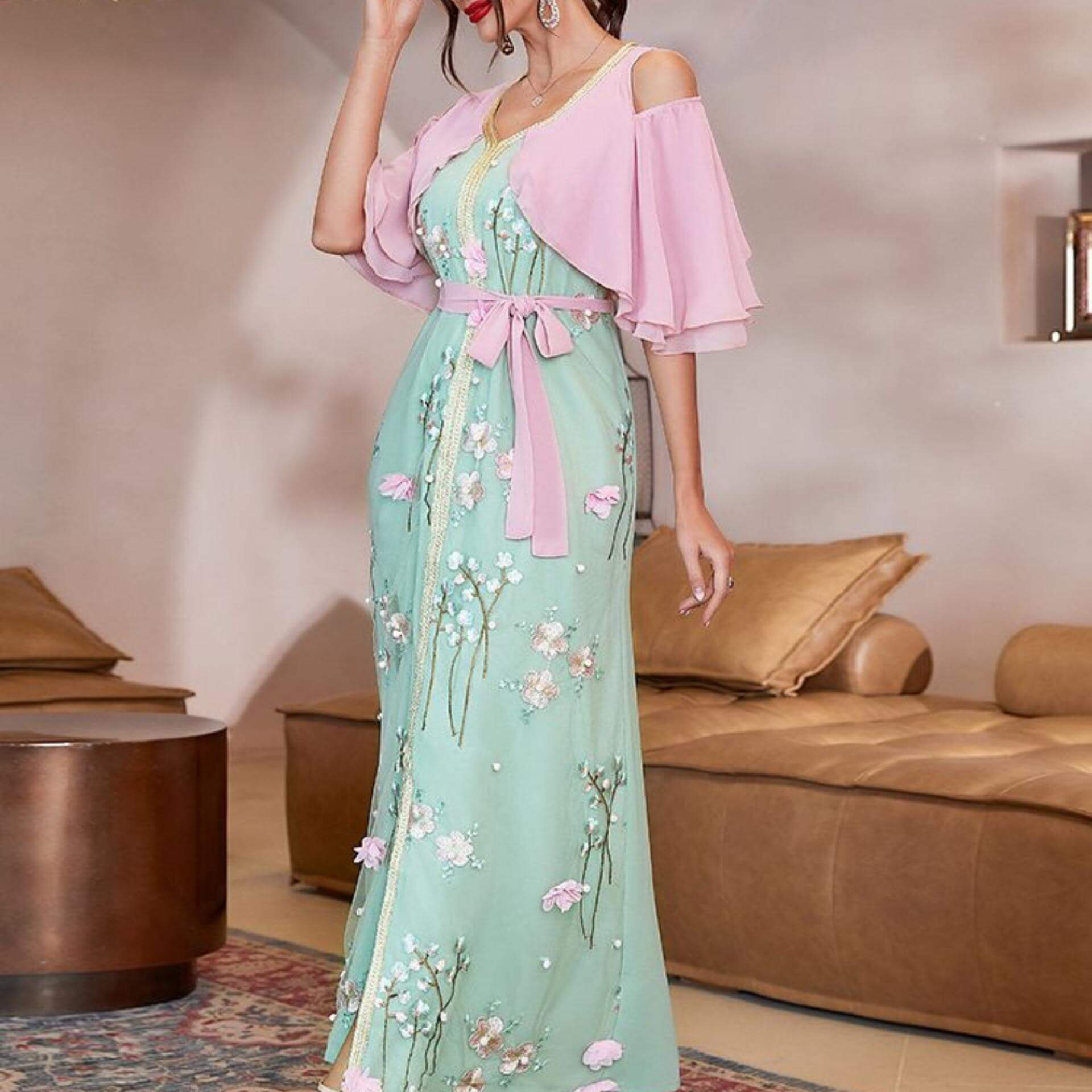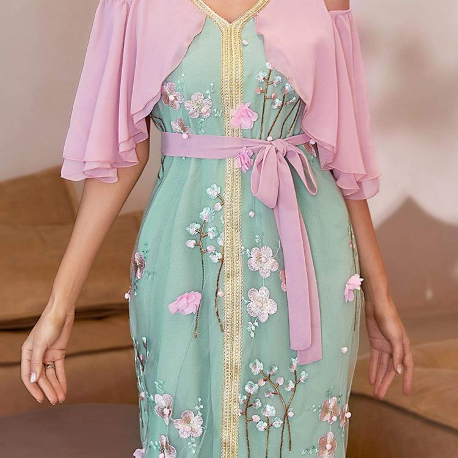 Voyez cette tenue orientale avec sa couleur verte et ses motifs roses raffinés, ainsi que son tissu en Polyester souple et confortable !