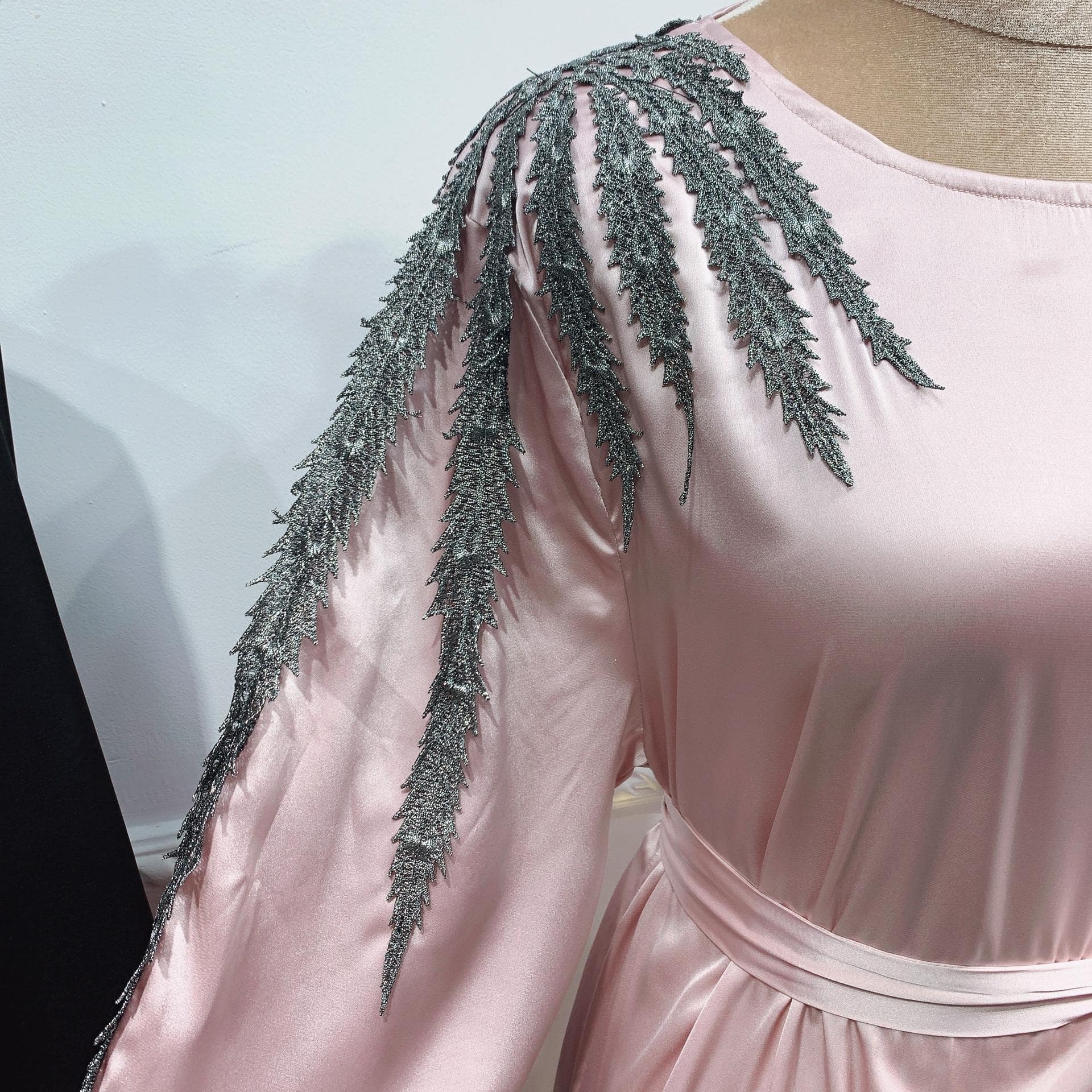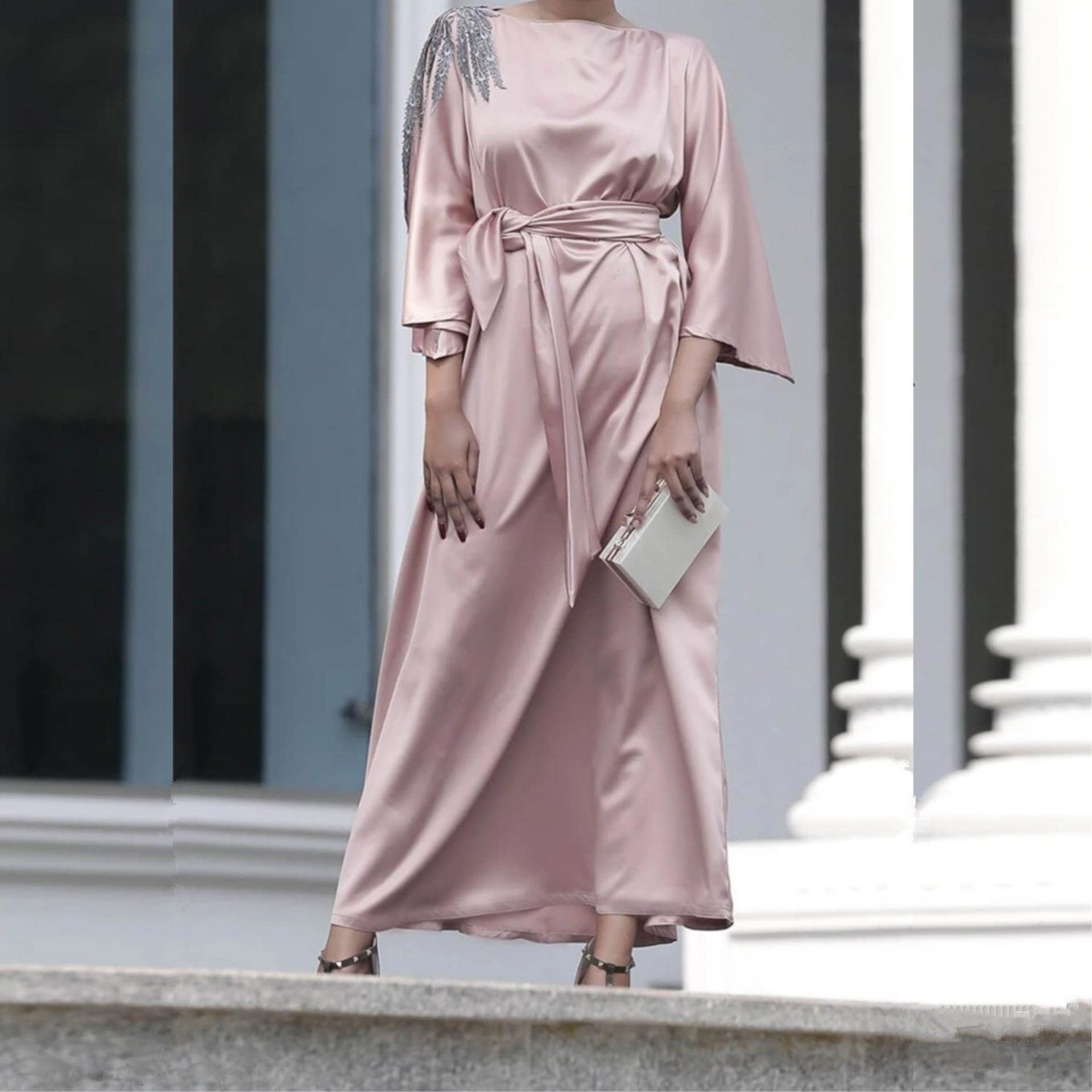 Les broderies argentées ajoutées à cette tenue apportent une touche de féminité et d’élégance ! De plus, le coloris rose de cette robe arabe permet de mettre en valeur vos traits !