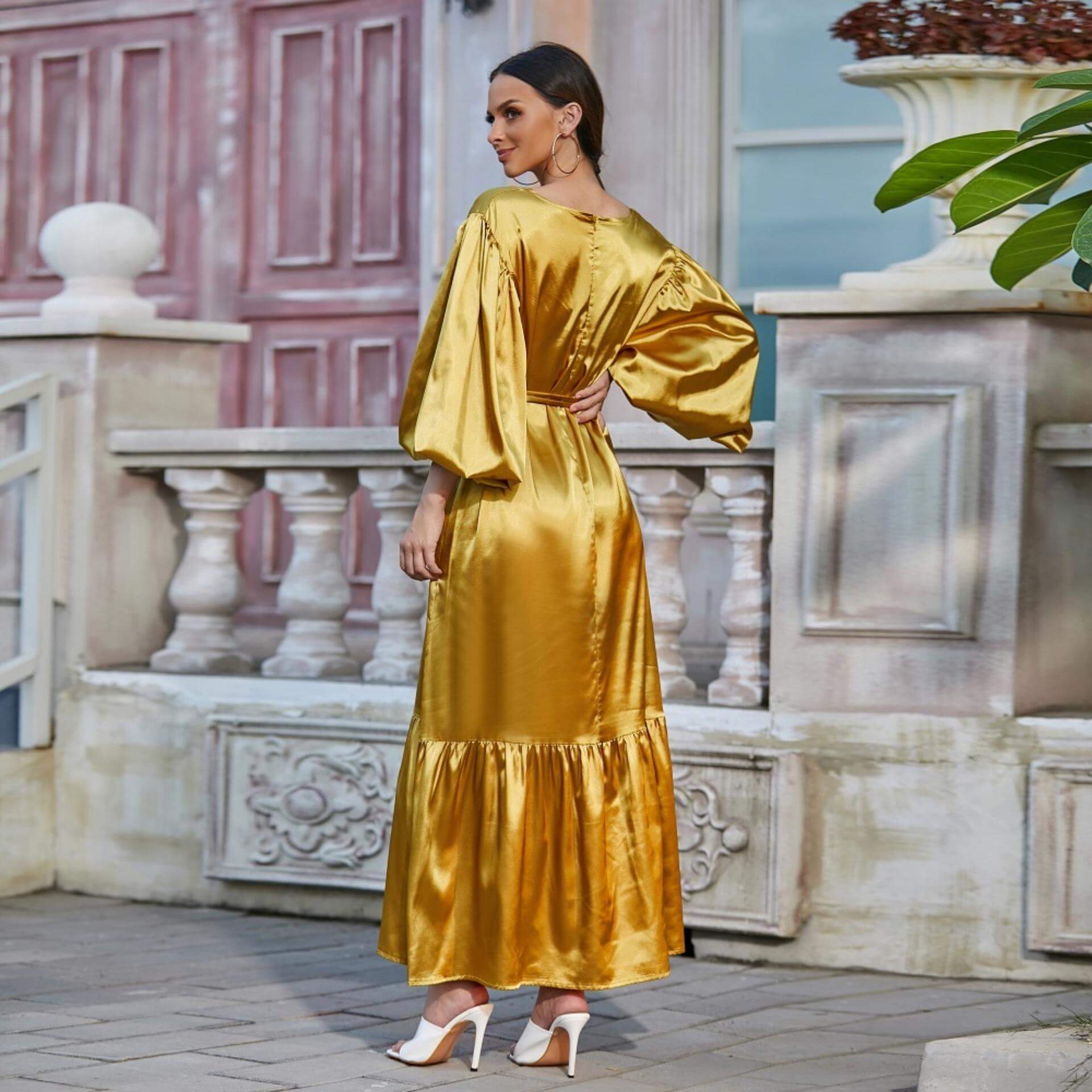 ROBE CAFTAN EN SATIN JAUNE: UN TON DISCRET !