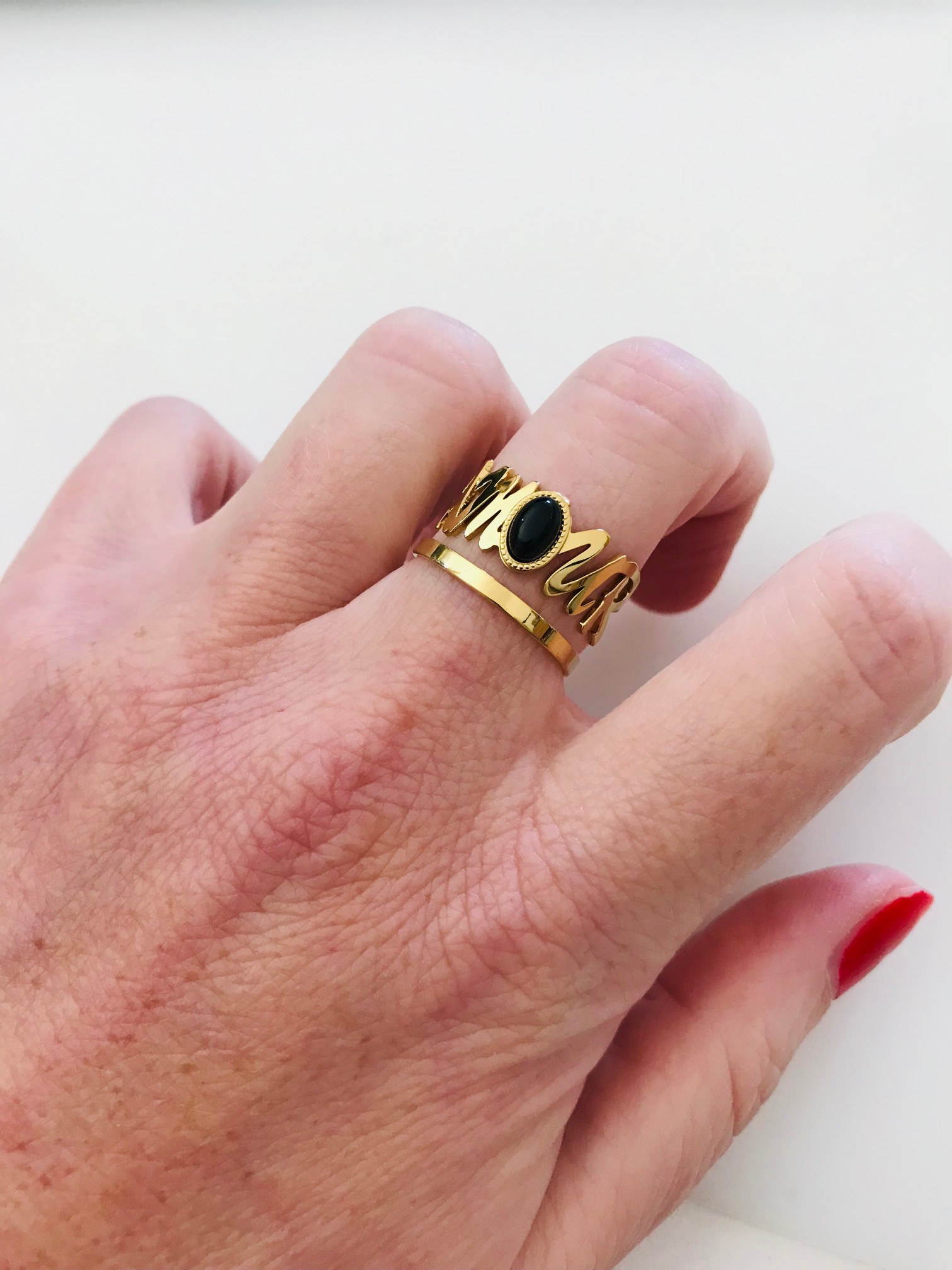 La pierre onyx noire, placée délicatement au centre de la bague, ajoute une dimension mystérieuse et élégante. Connue pour ses propriétés protectrices et sa beauté envoûtante, l’onyx apporte un contraste parfait avec la couleur dorée de la bague. Cette pierre semi-précieuse incarne à la fois le pouvoir et la confiance, tout en renforçant le caractère intemporel de ce bijou.