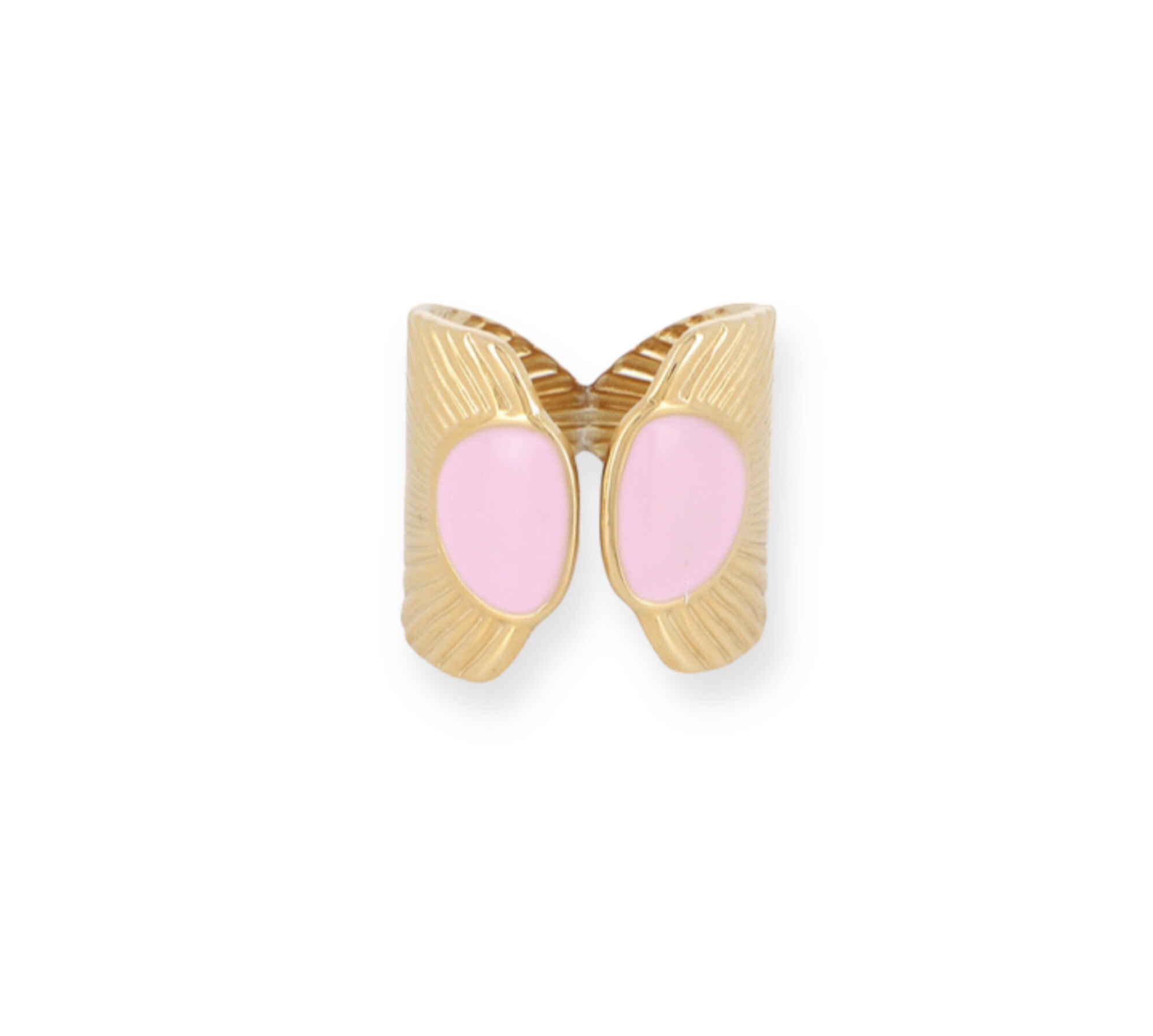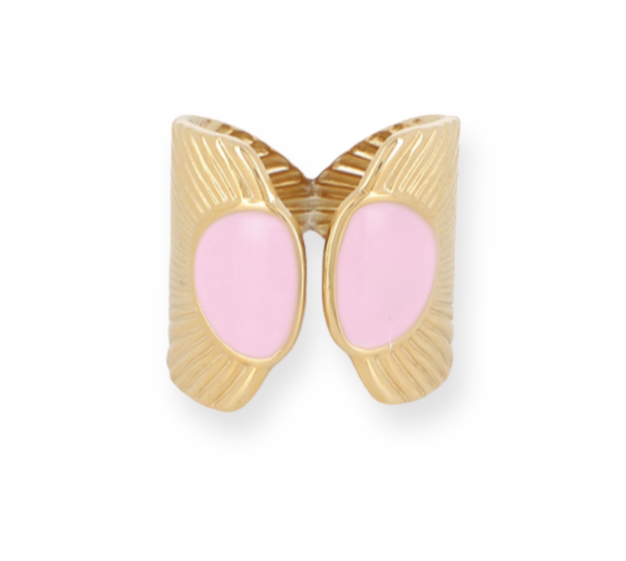 Cette bague géométrique émail rose réglable en acier doré est un accessoire de mode élégant.