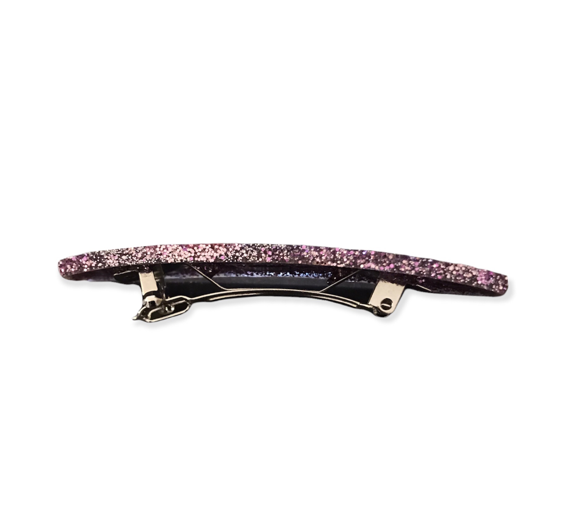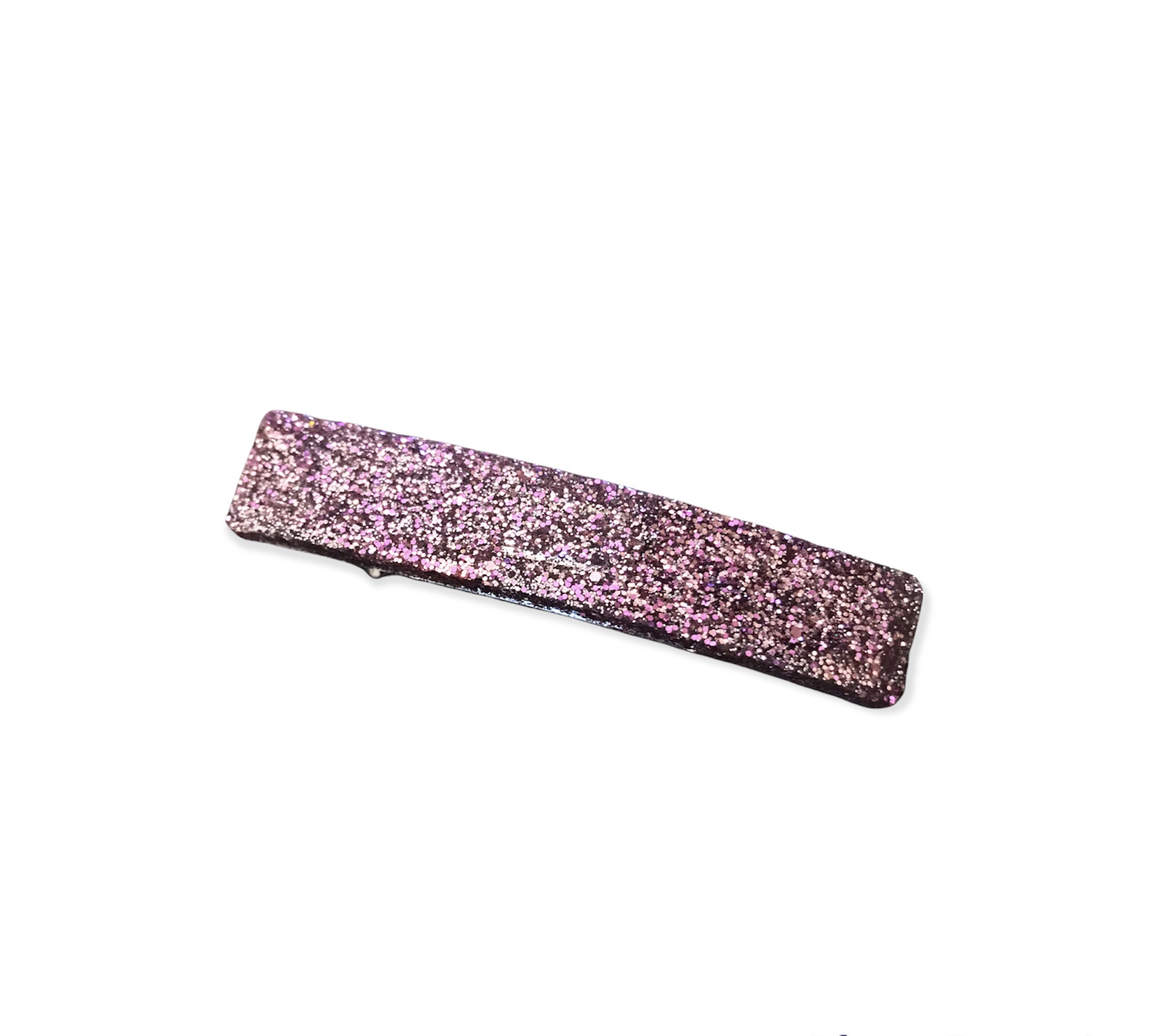 Barrette en résine contenant un mélange de paillettes aux teintes roses, argentées ou encore dorées.
