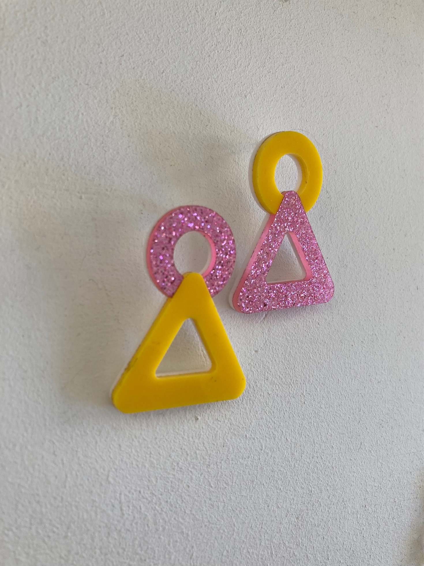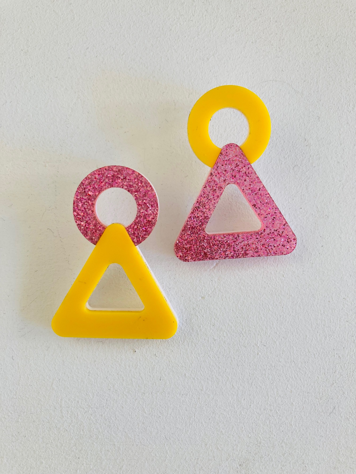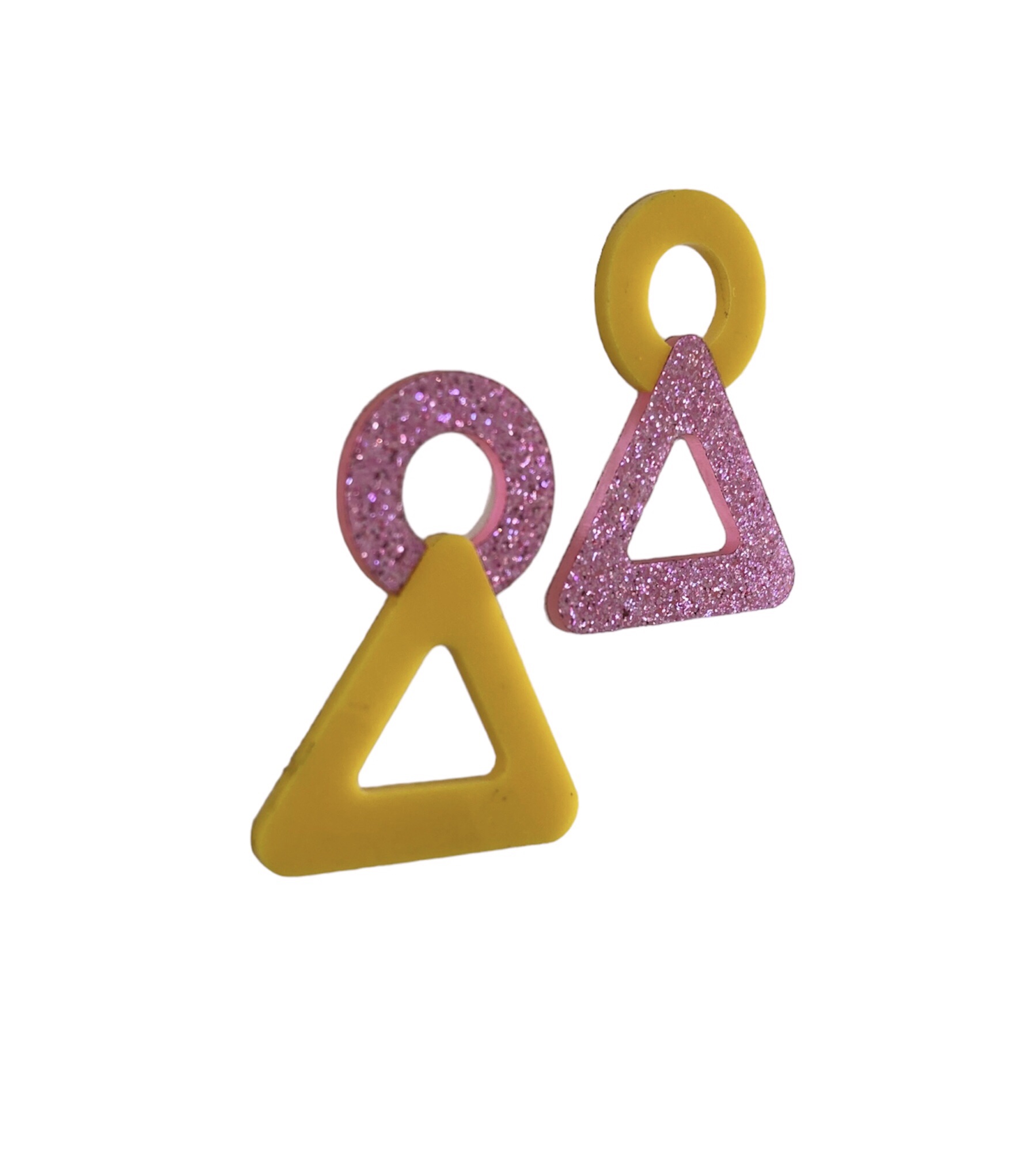 - Boucle 2: rond rose pailleté au-dessus d’un triangle jaune