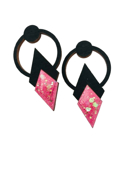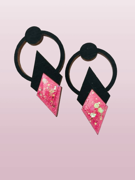 Caractéristiques des boucles d’oreilles géométriques en bois et en résine rose :