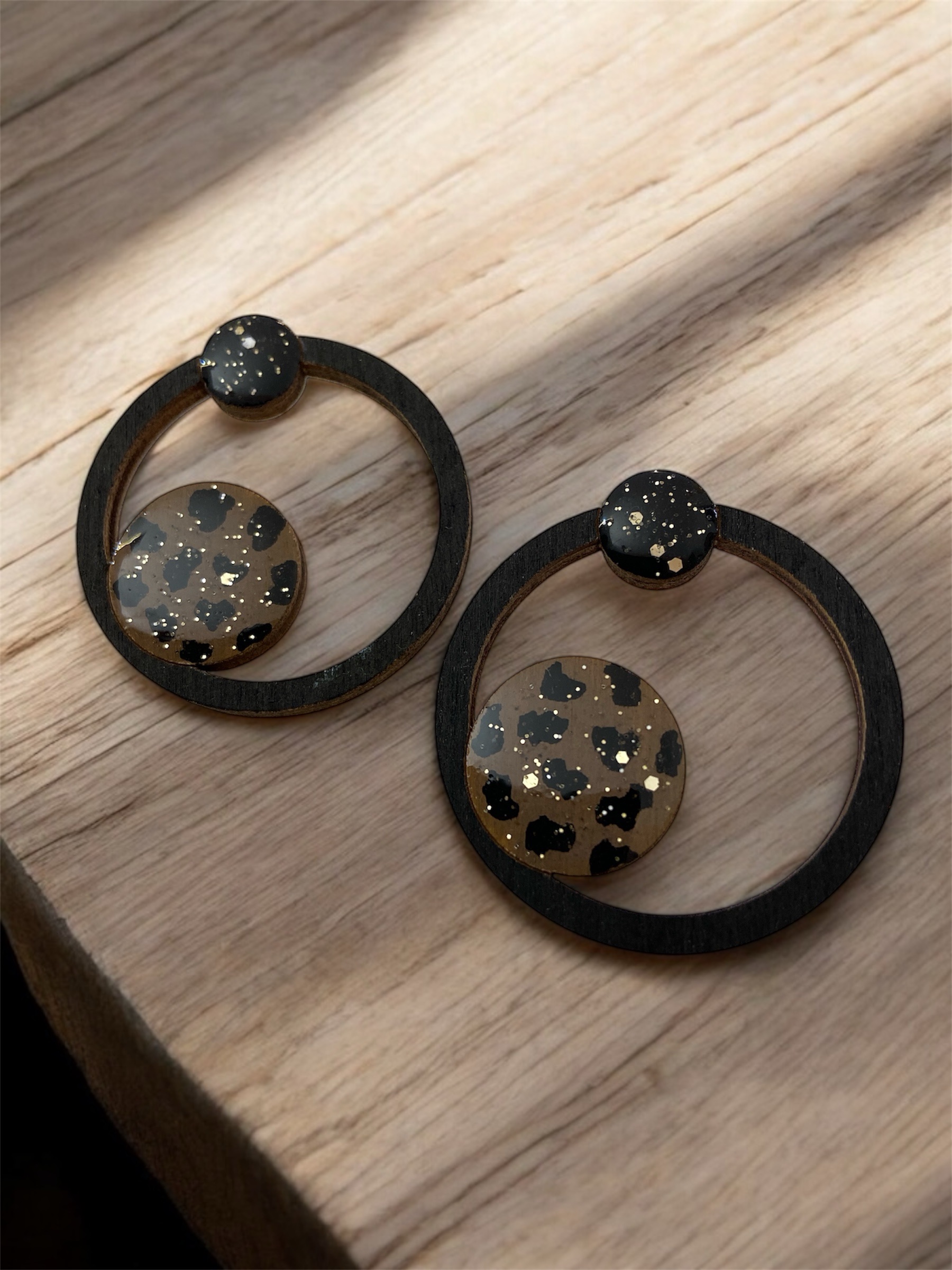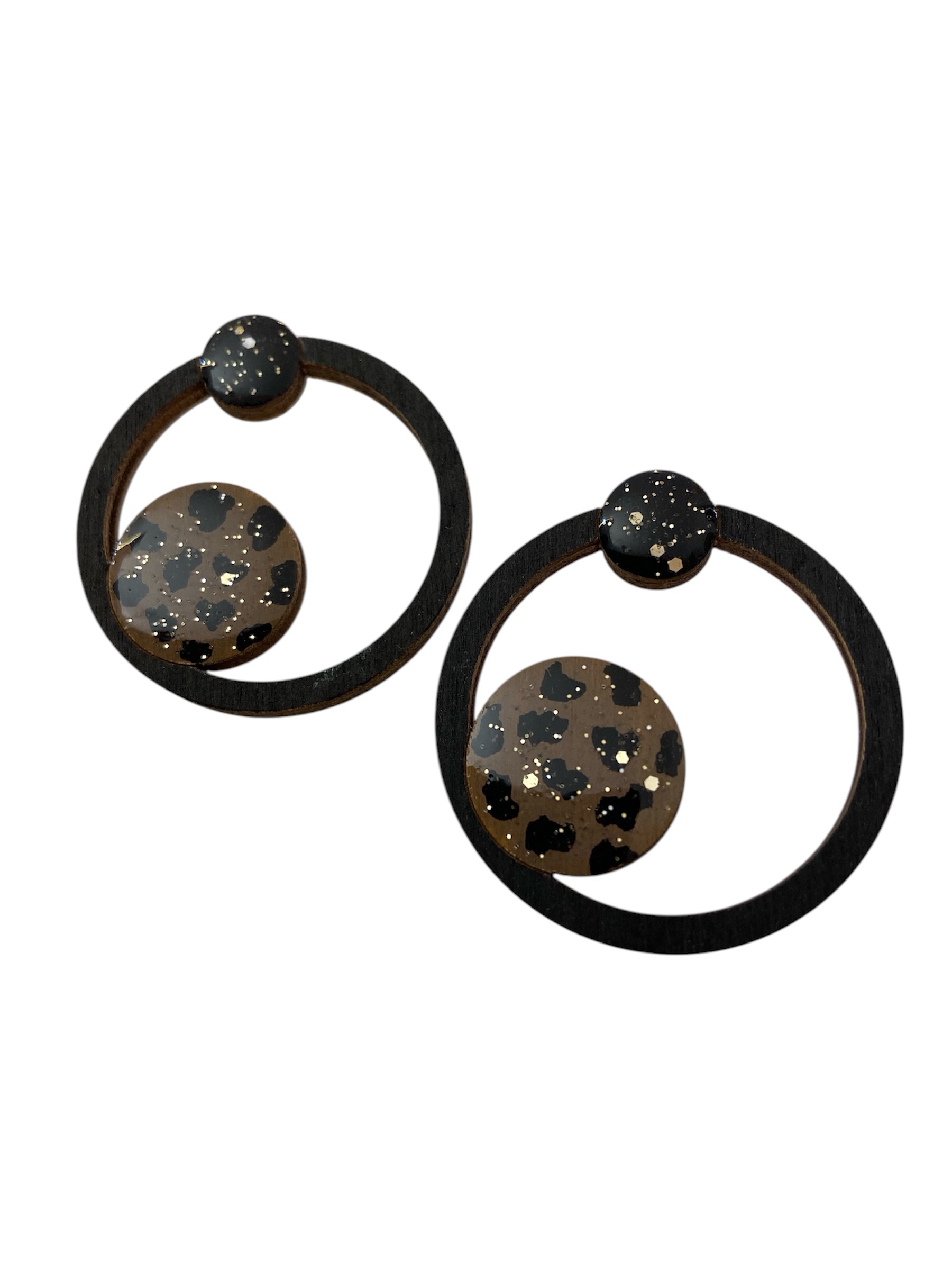 • Deux petits ronds de tailles différentes, peints à la main avec un motif léopard revisité : des taches noires sur un fond brun-doré, agrémentées de touches de paillettes dorées pour une brillance délicate et sophistiquée.