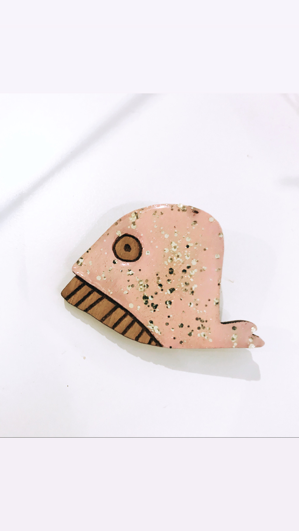 La broche baleine est le coup de cœur de Morgane ! En effet, imaginée et dessinée par sa fille, elle a voulu lui faire la surprise de la réaliser en broche ! Et c’est un joli succès ! Base en bois, peinte, pailletée et résinée