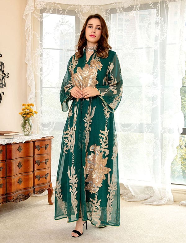 Broderie À Paillettes Bleu Caftan Femmes Robe Arabe