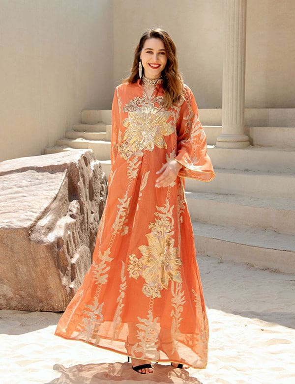 Broderie À Paillettes Orange Caftan Femmes Robe Arabe