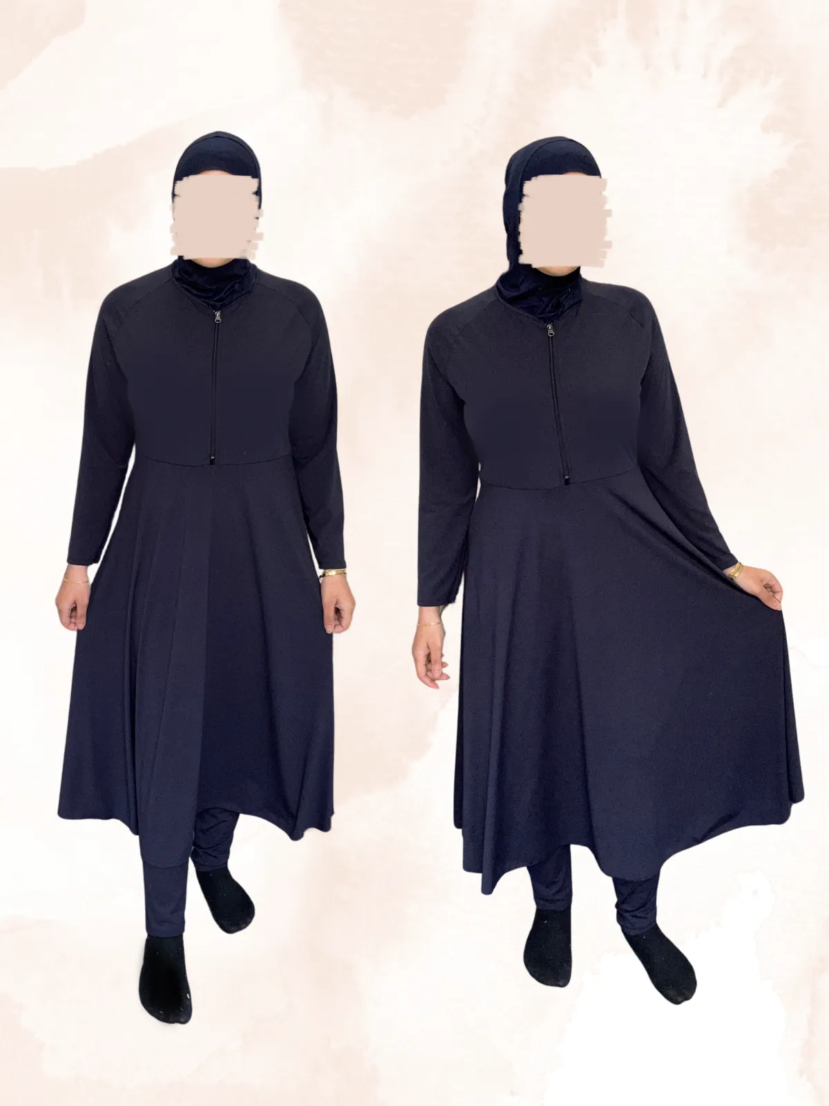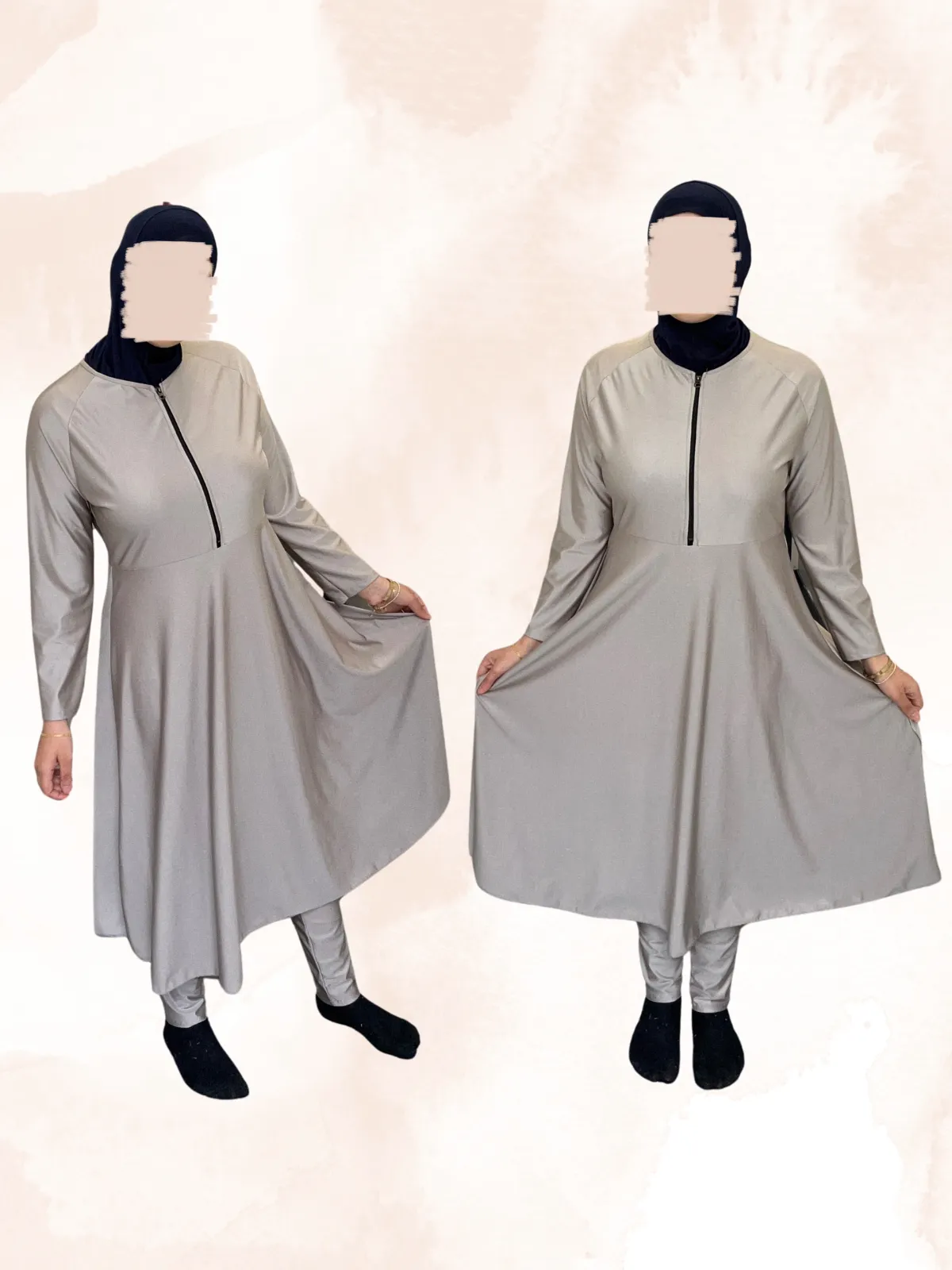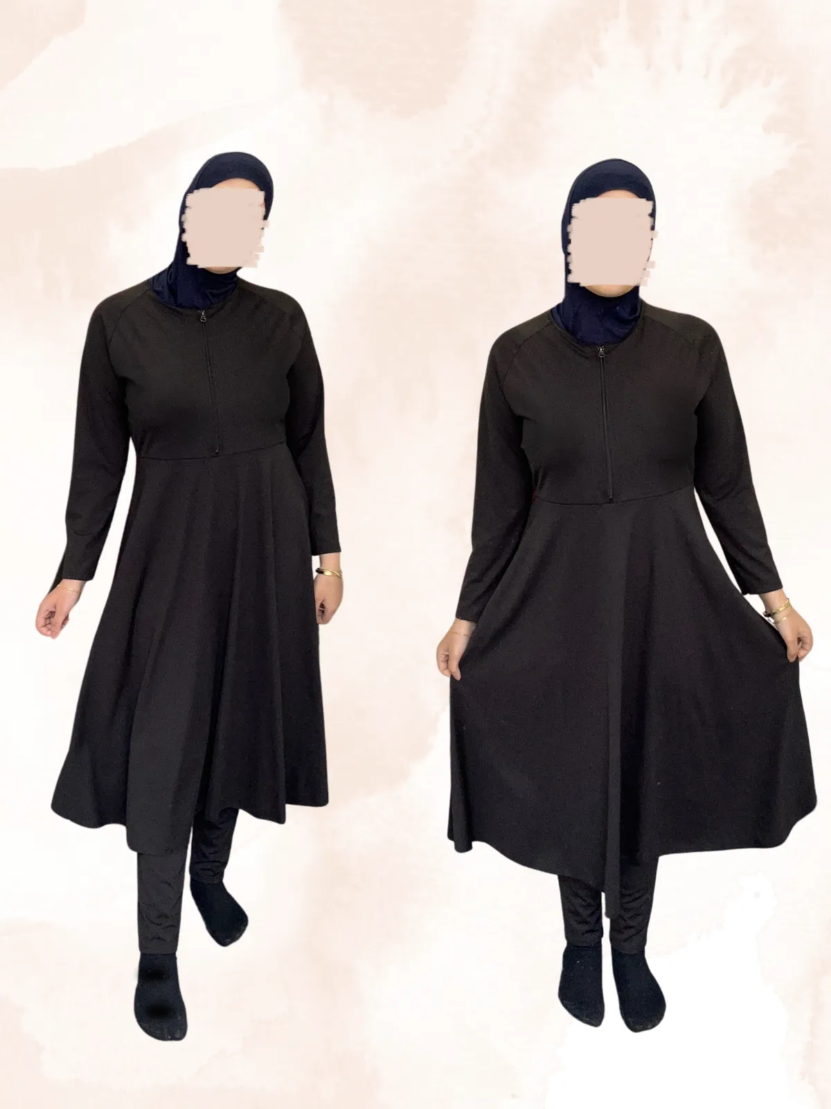 Le burkini est composé d’une robe longue cintrée qui épouse les formes en douceur sans les mouler, et d’un legging confortable qui couvre les jambes jusqu’aux chevilles. Il est conçu pour s’adapter jusqu’à la taille 42 et à une stature de 1m70, offrant une coupe fluide et bien pensée pour les silhouettes moyennes. Sa forme deux pièces permet une grande liberté de mouvement, tout en assurant une couvrance maîtrisée.