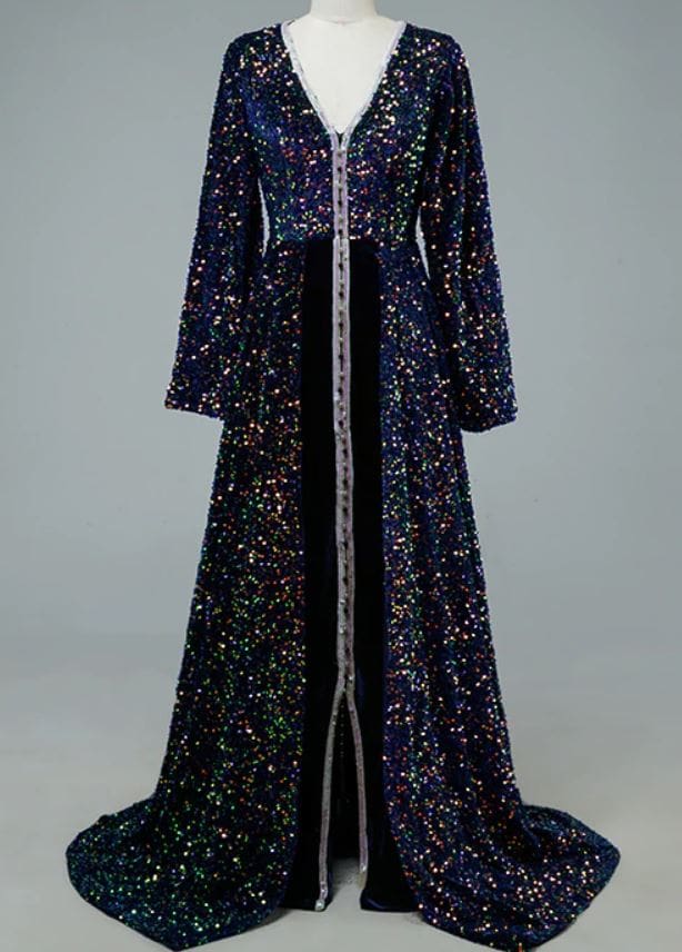 Le caftan Batina est de couleur bleu foncé avec des broderies. La ceinture est incluse.