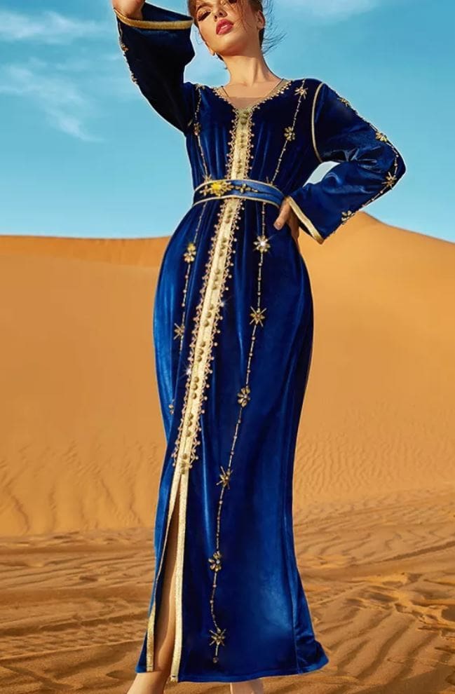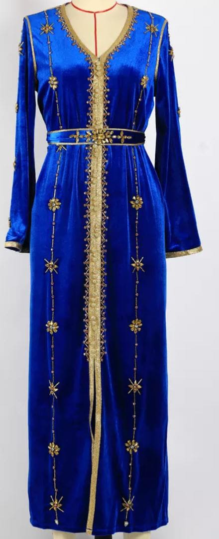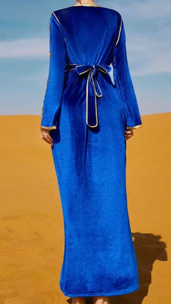 Le caftan Chemsa est une robe bleue avec une ceinture et des broderies de couleur dorée.