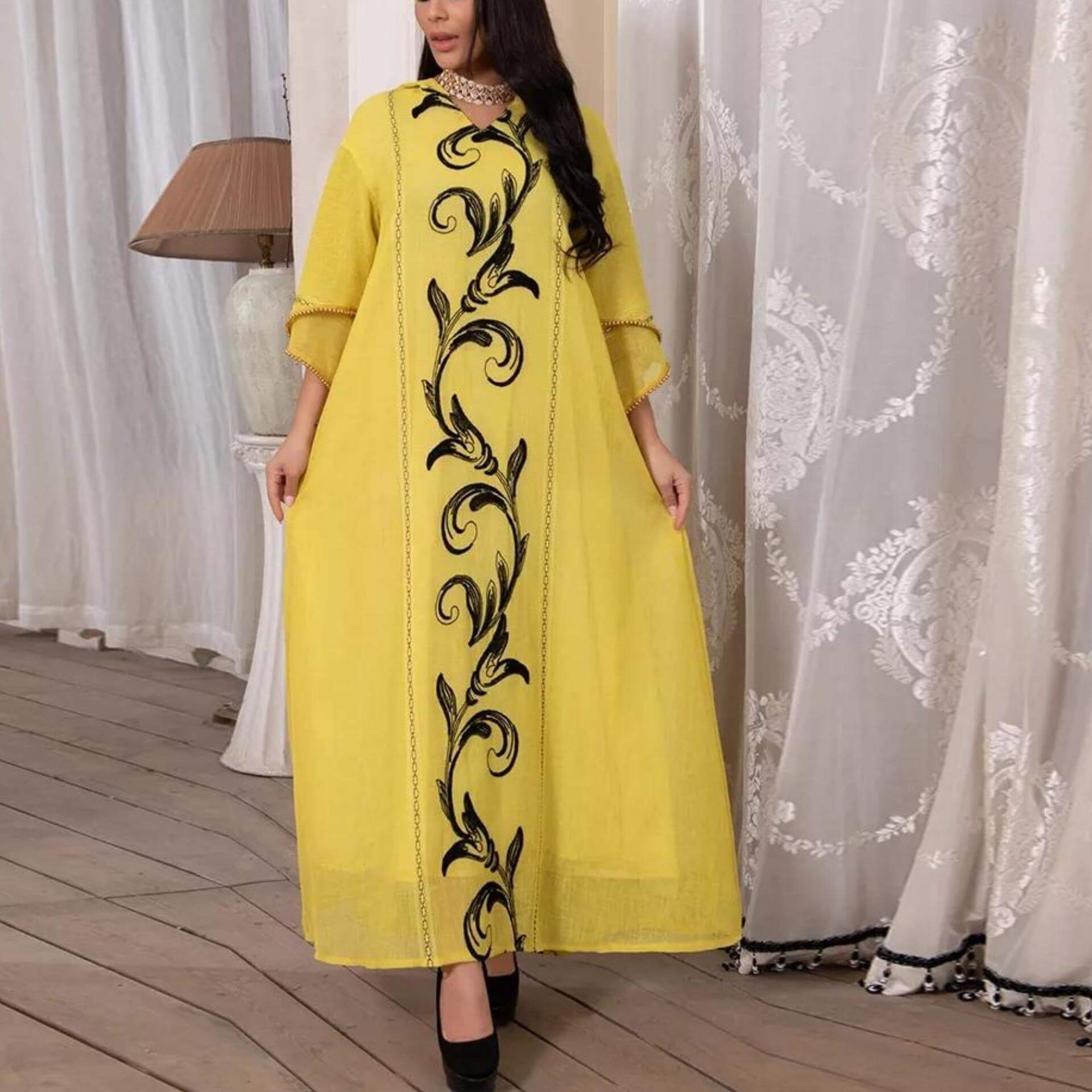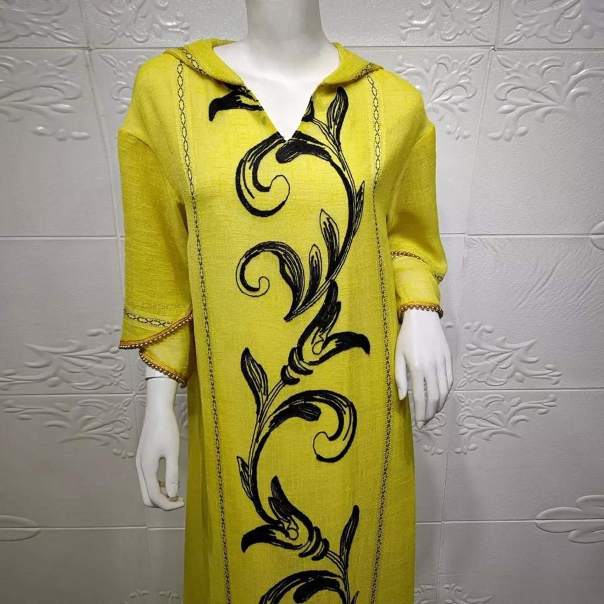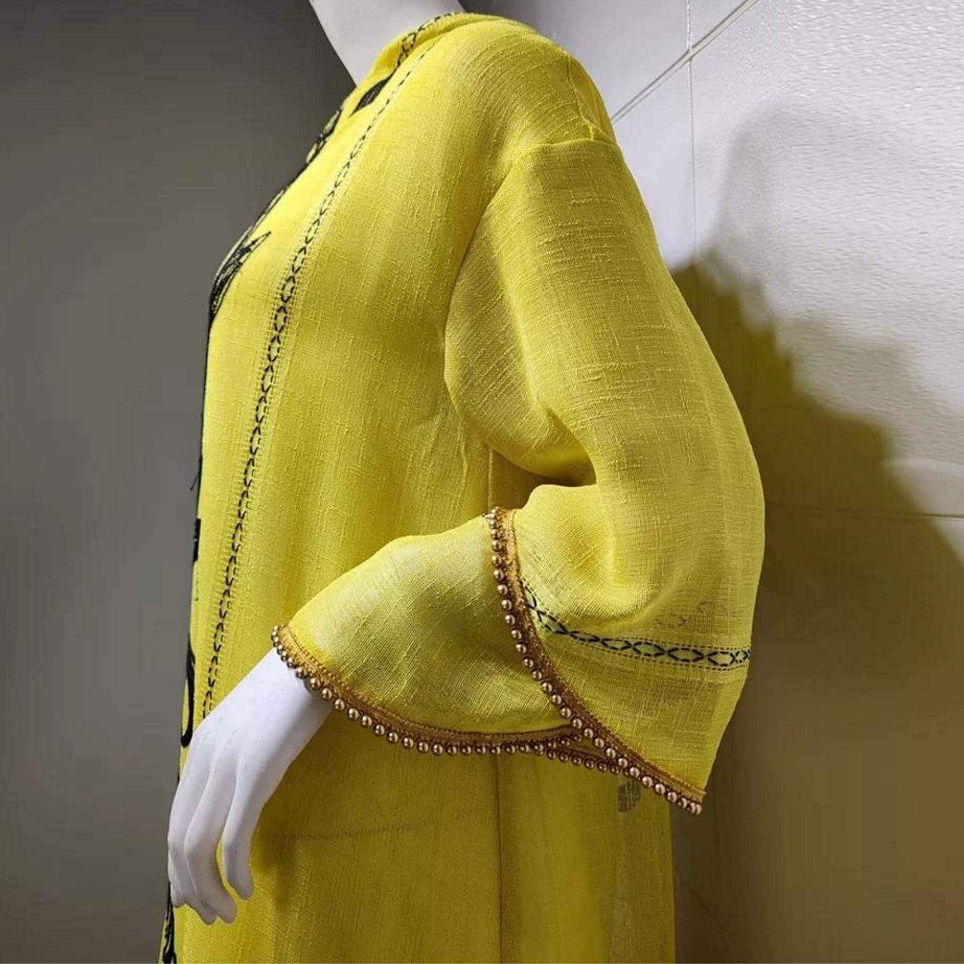 Son teint jaune peut paraître inattendu pour une tenue maghrébine, mais elle possède un immense charme ! Elle est également ornée de décorations noires pour la rendre plus belle !