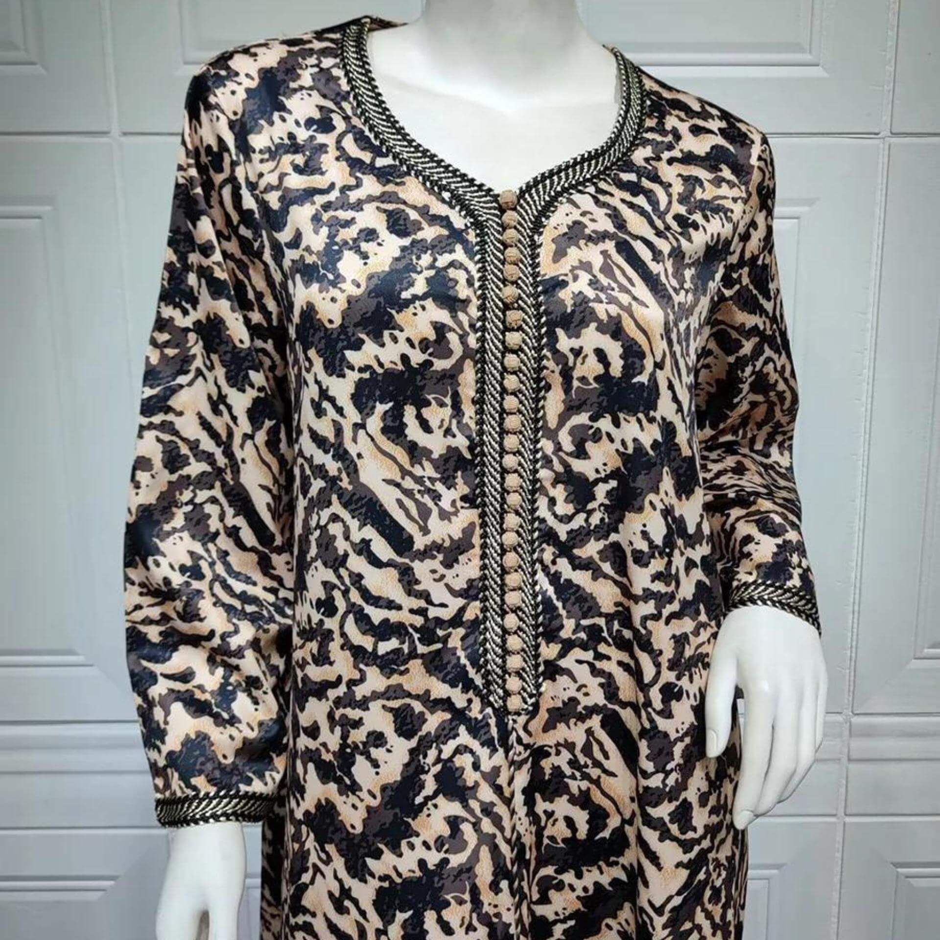 Nous avons restauré des tissus de grande qualité pour ce caftan à motifs, pour vous offrir un confort et une douceur incomparable ! C’est pour cela que nous avons fait le choix d’utiliser le Polyester pour rendre cette tenue à la fois chic et agréable !