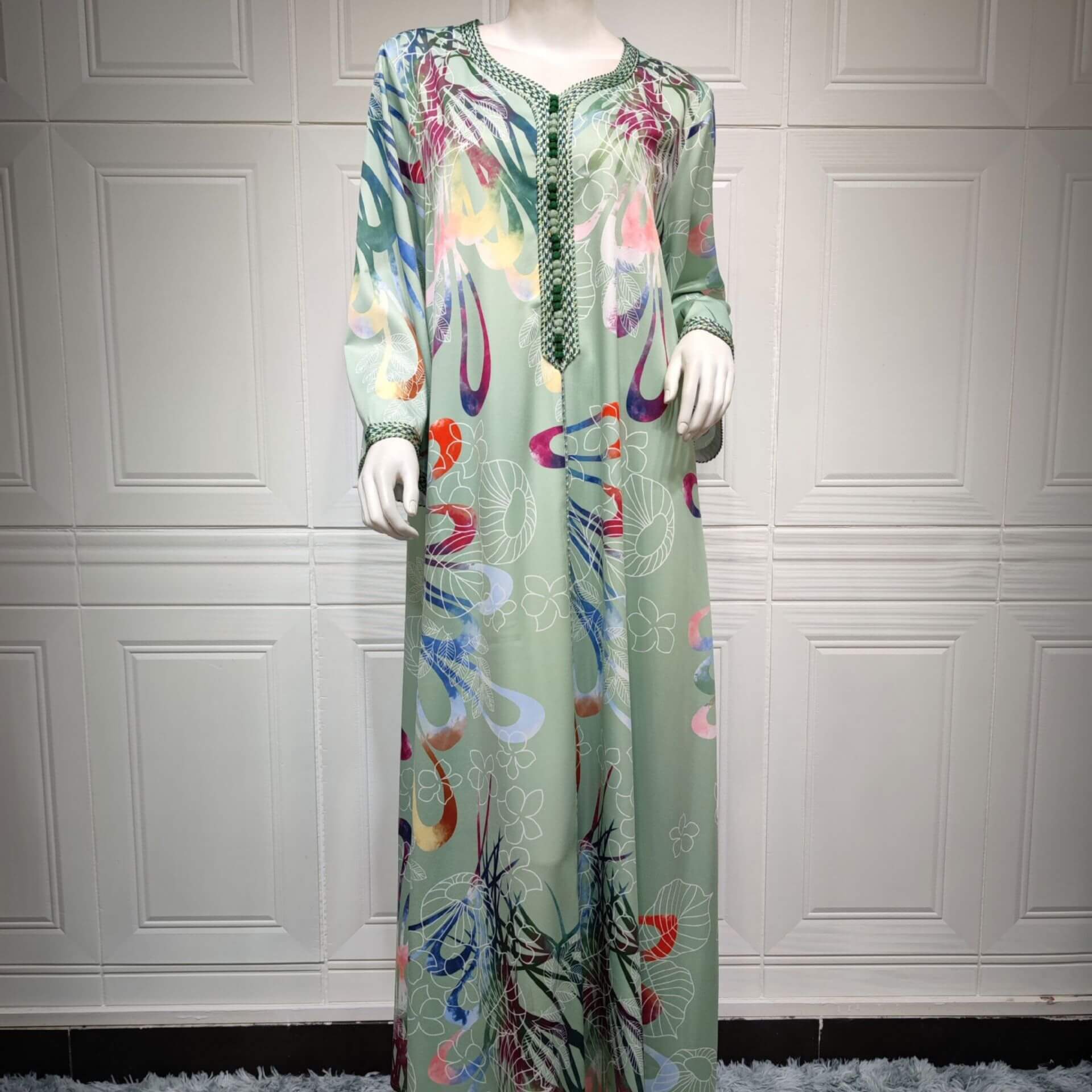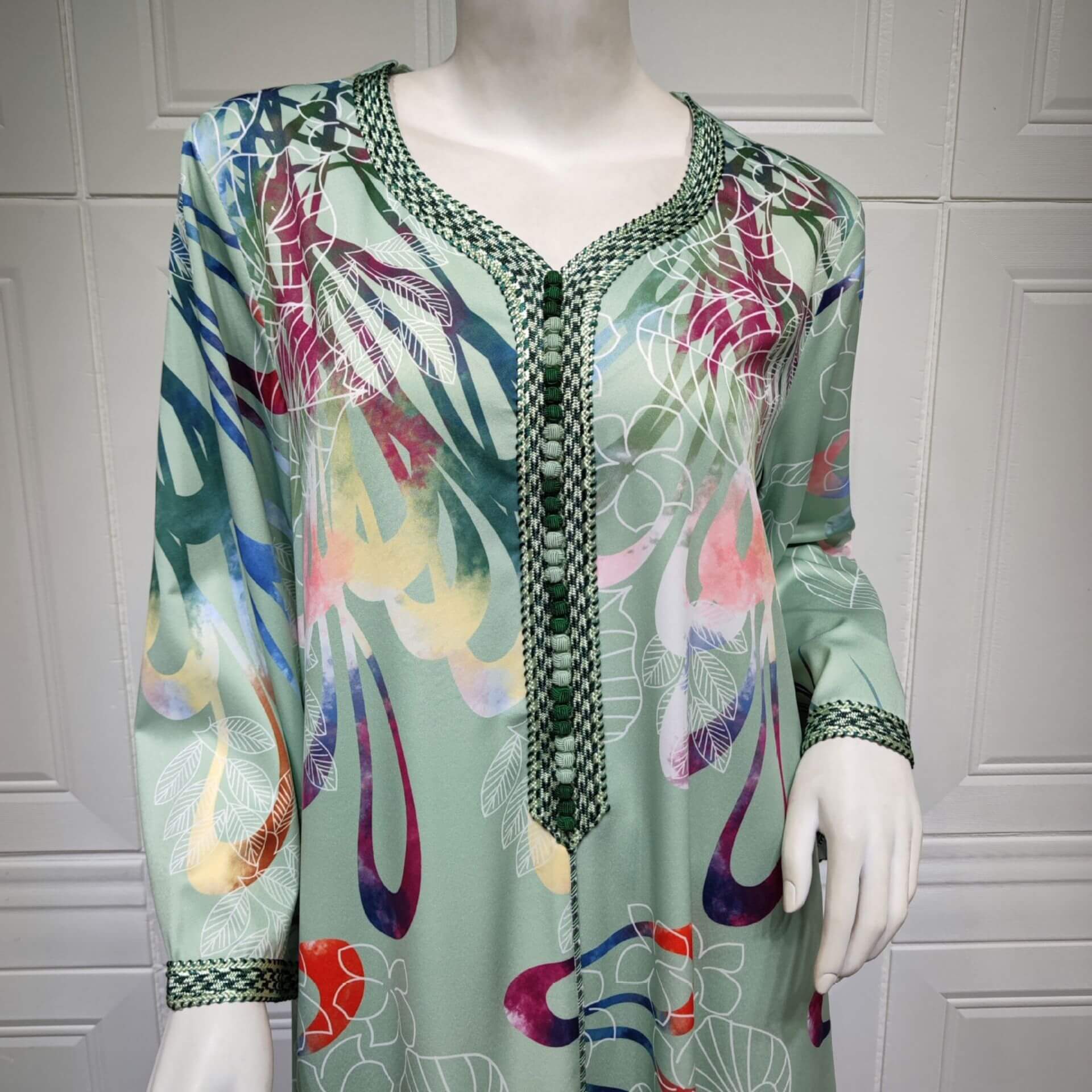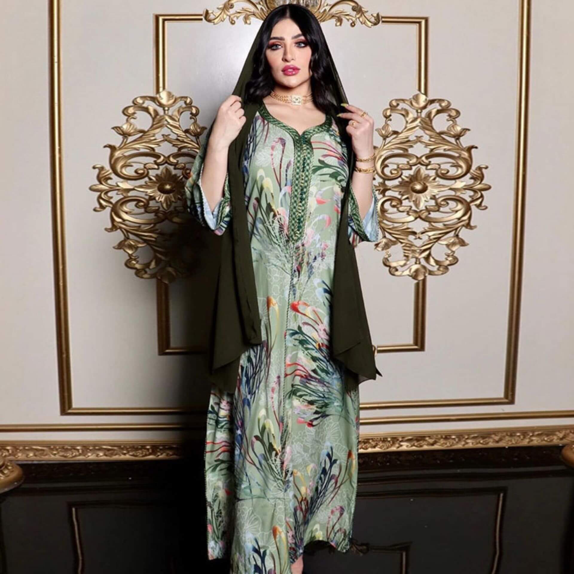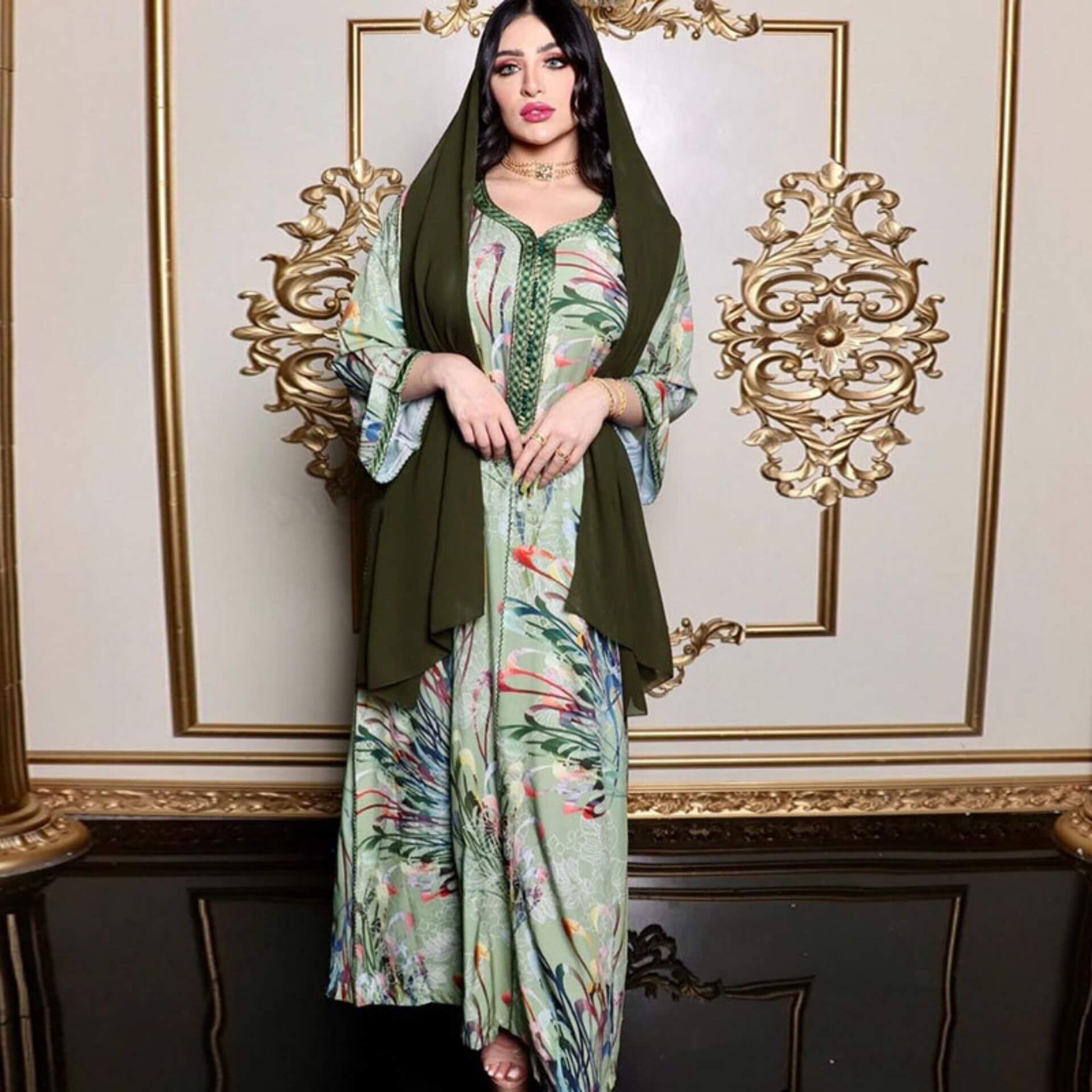Confort et style vont de pair avec cette robe orientale verte ornée de fleurs !