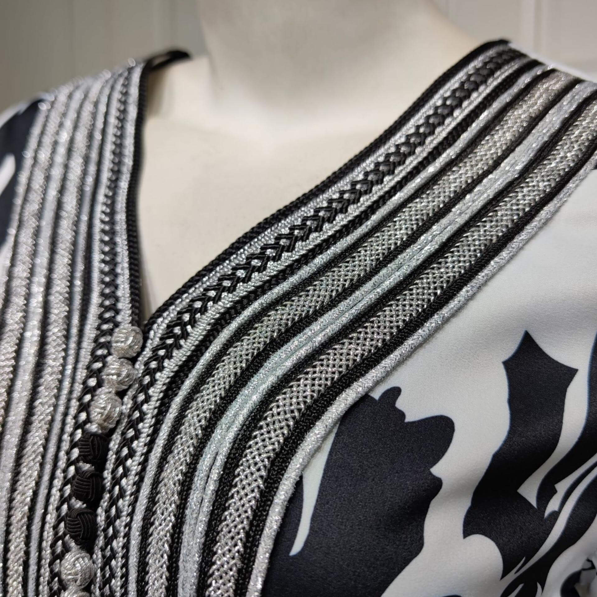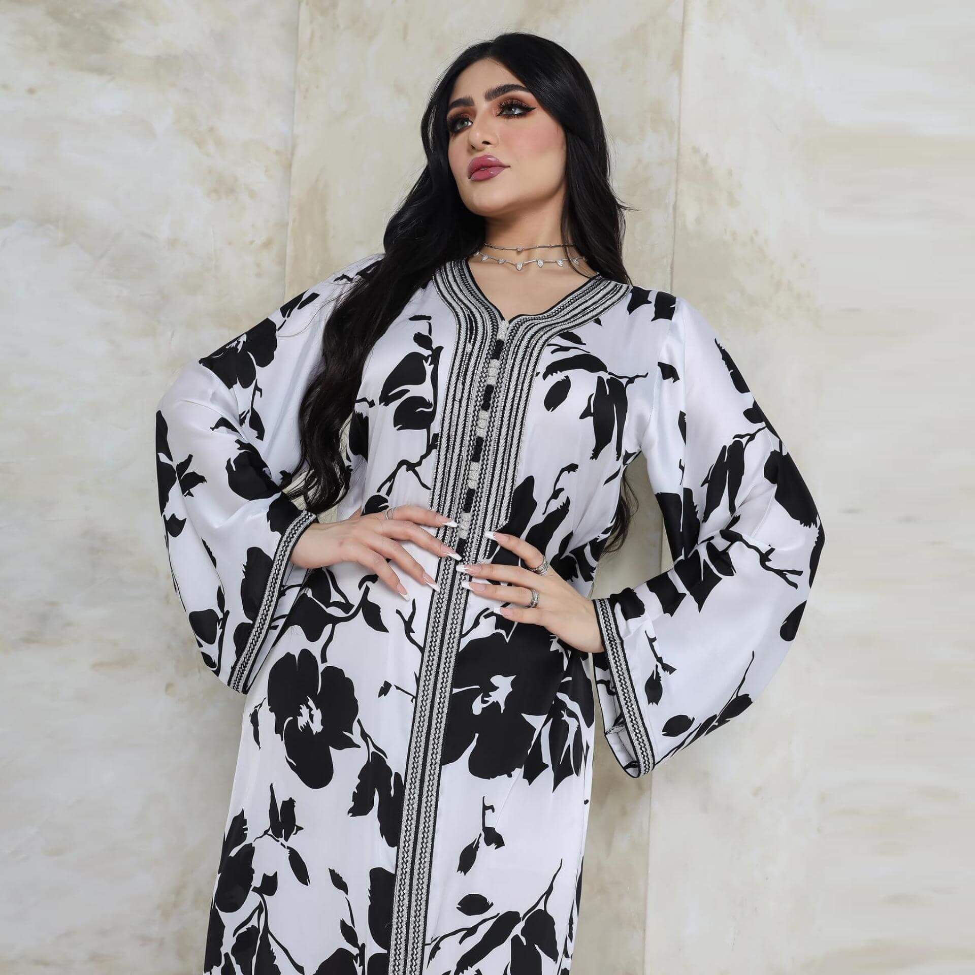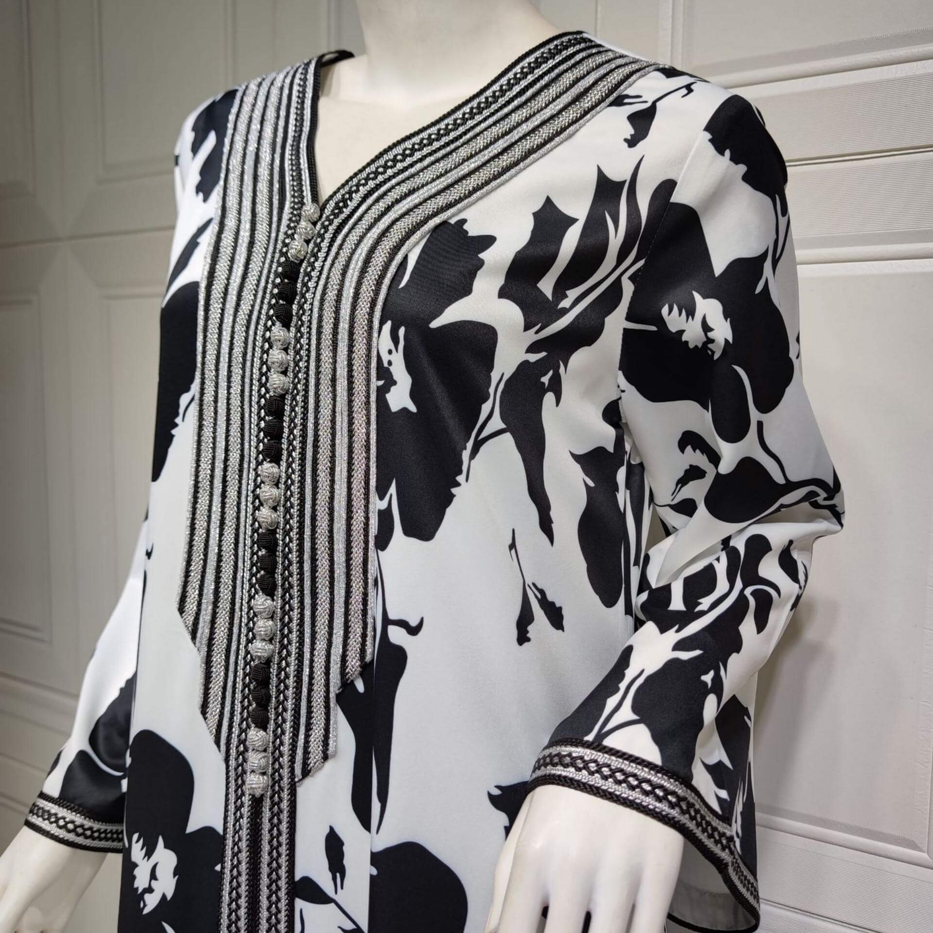 Cette robe marocaine possède des motifs noirs floraux et un fond blanc qui en font une tenue élégante et chic !