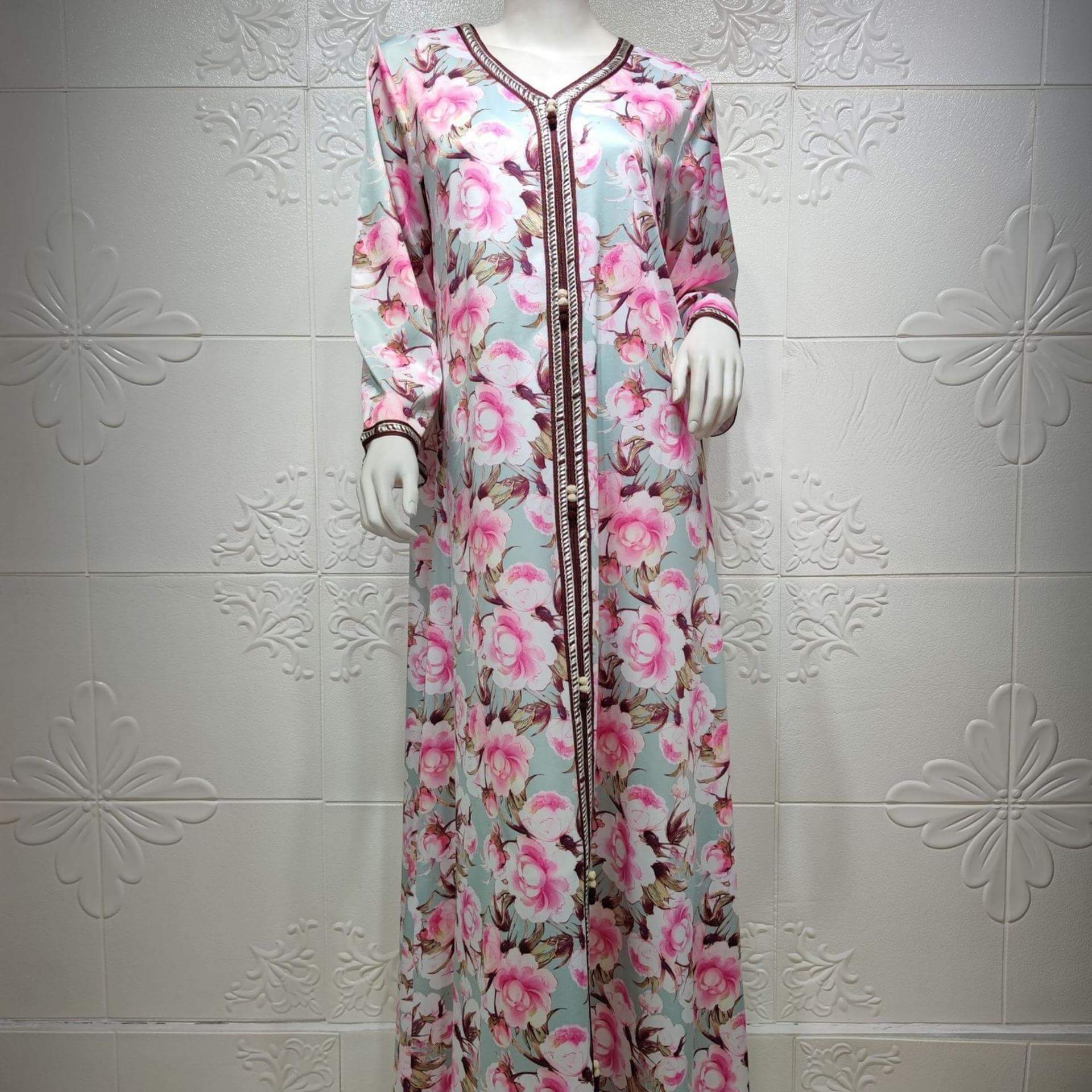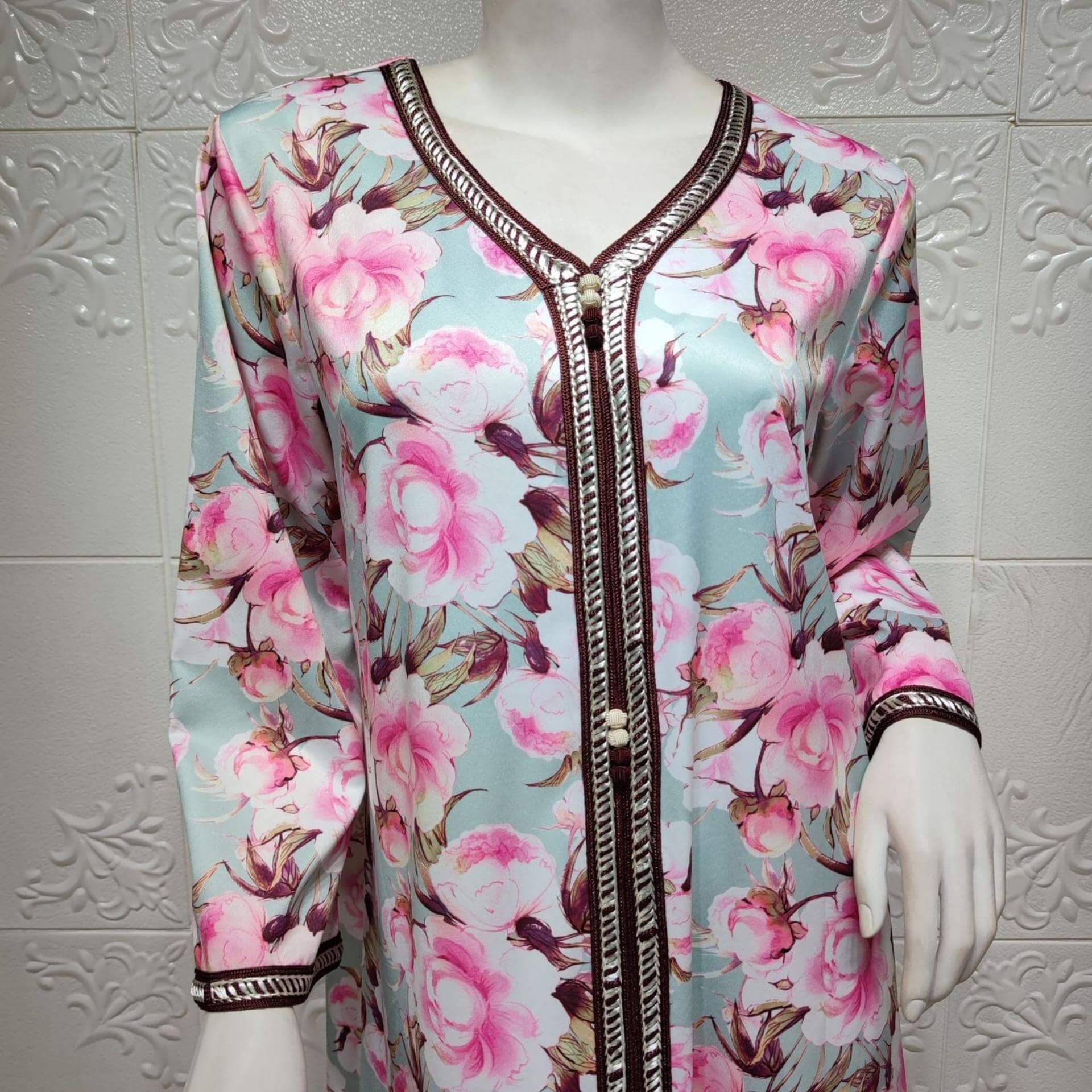 Avec ses motifs floraux et son coloris attrayant, ce caftan marocain est la pièce idéale pour votre garde-robe. Fabriqué dans un tissu reconnu pour sa douceur et sa fluidité, vous serez à l’aise en le portant !