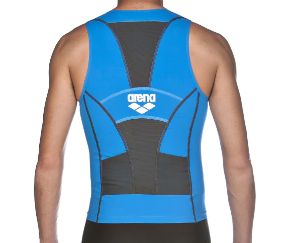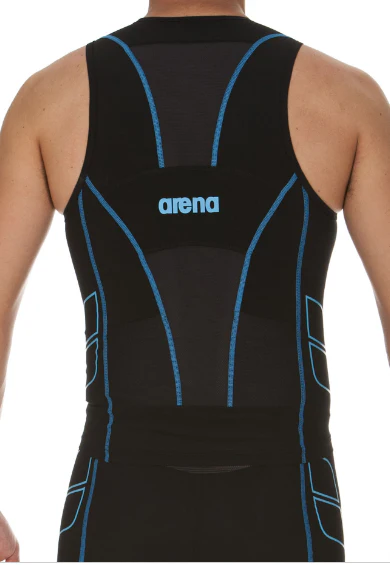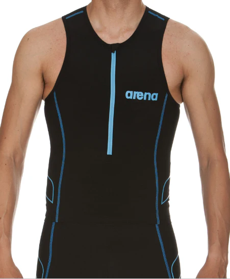 Le haut Arena Tritop ST noir turquoise ou bleu brillant pour homme allie deux matériaux ultra technologiques : le X-raptor et le Xtra Life Lycra pour assurer une compression optimale, moins de frottements et une résistance unique. sa fermeture éclair frontale favorise les transitions plus rapides et les coutures plates améliorent l’hydrodynamisme de l’athlète. Les poches en maille sont spécialement conçues dans le but de réduire la résistance. Un modèle qui se distingue également par ses pièces en maille qui favorisent l’aération.