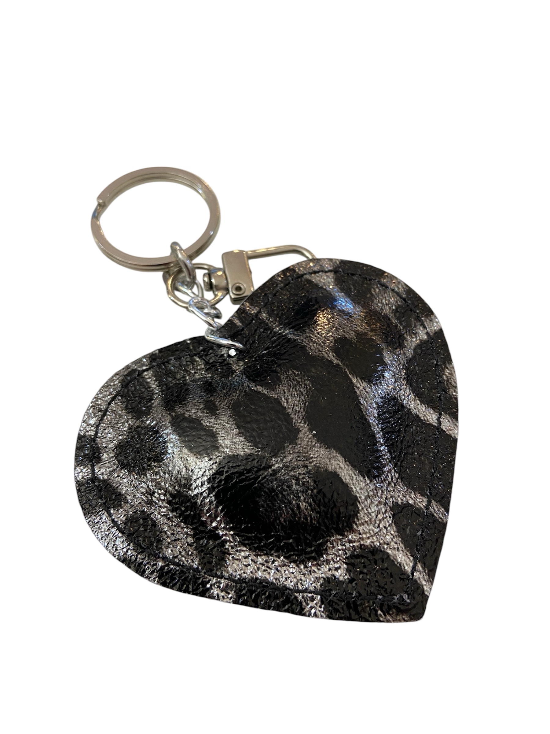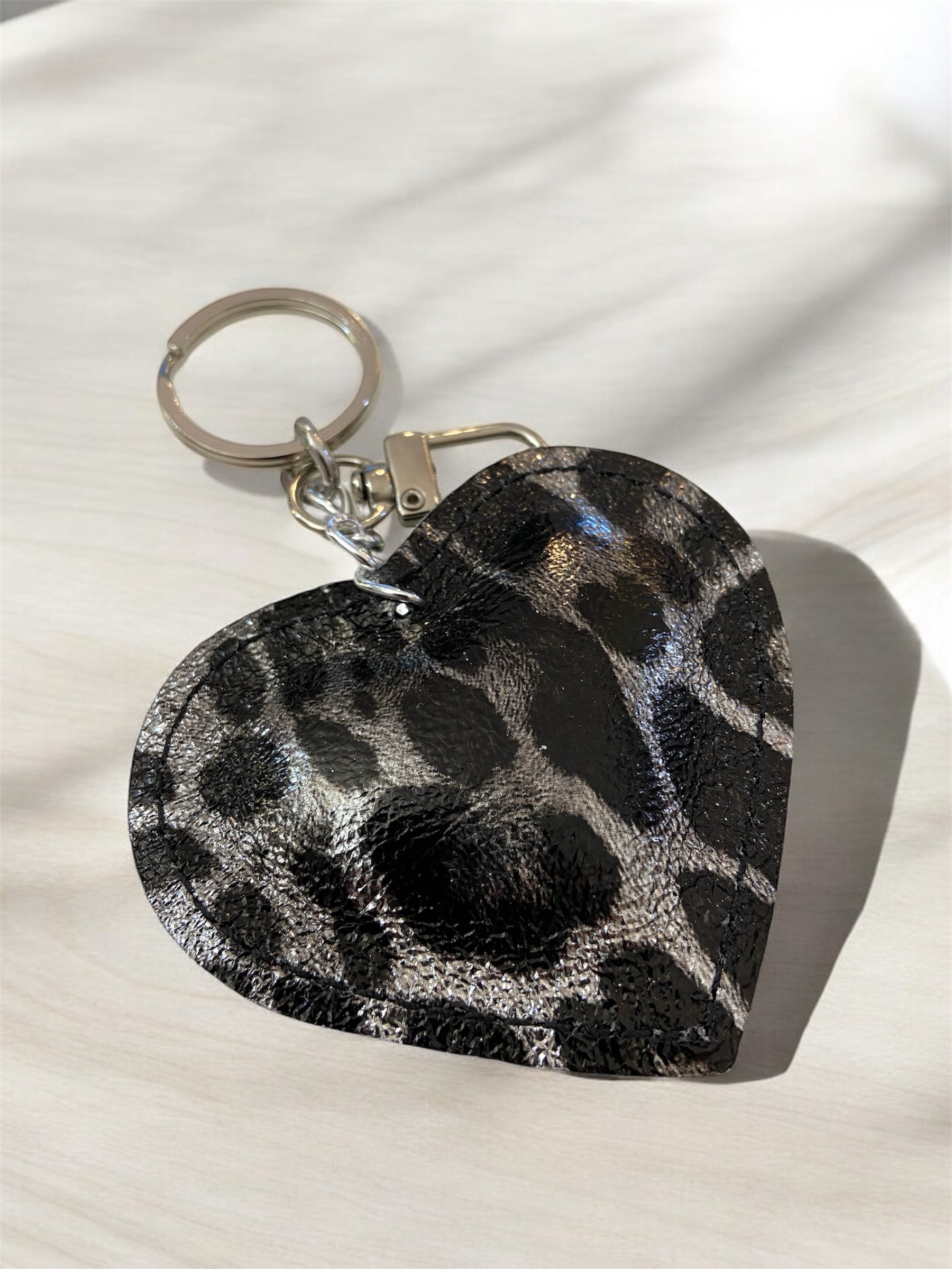 Porte-clés cœur léopard noir et argent en cuir : un accessoire élégant et pratique