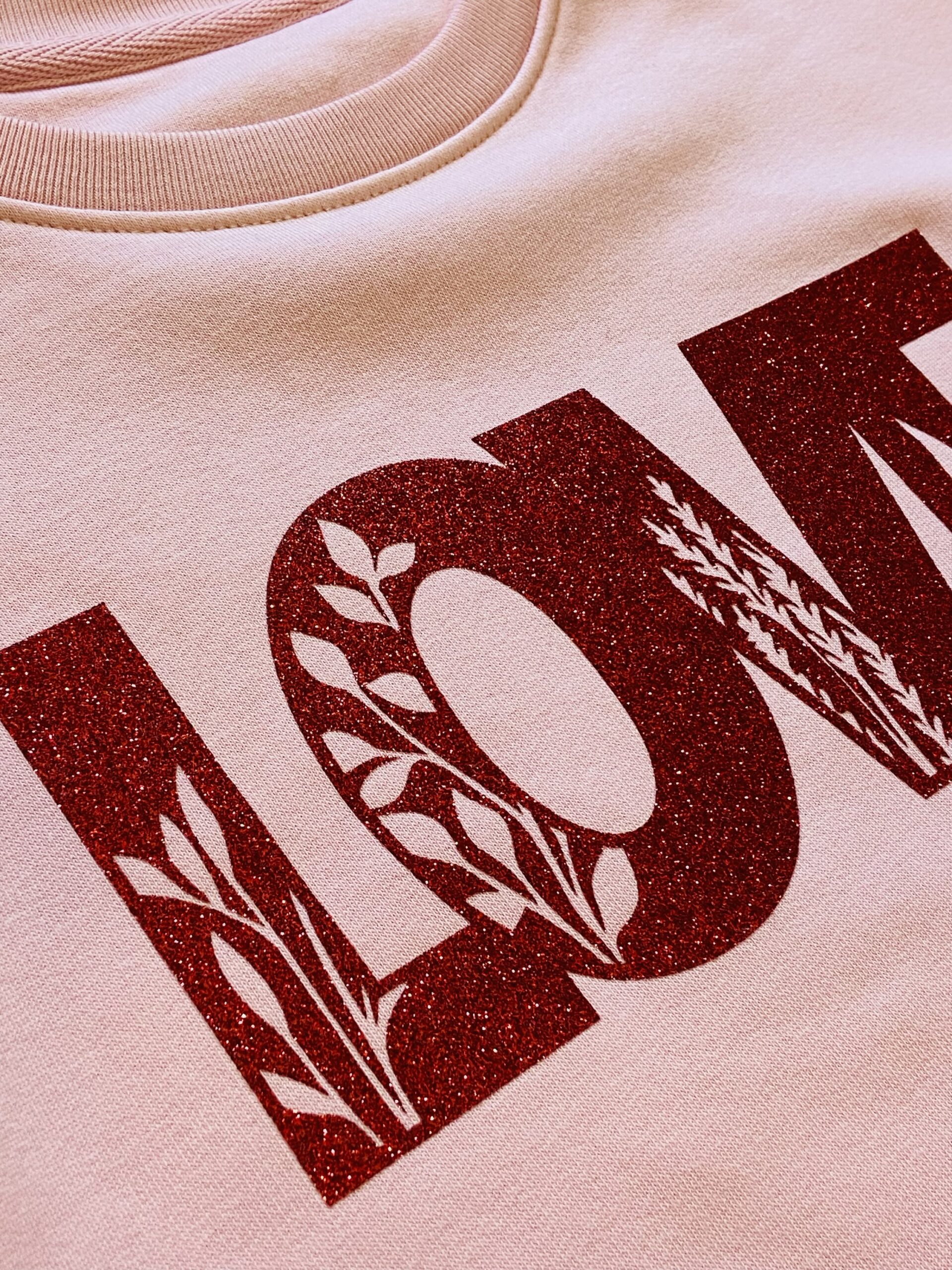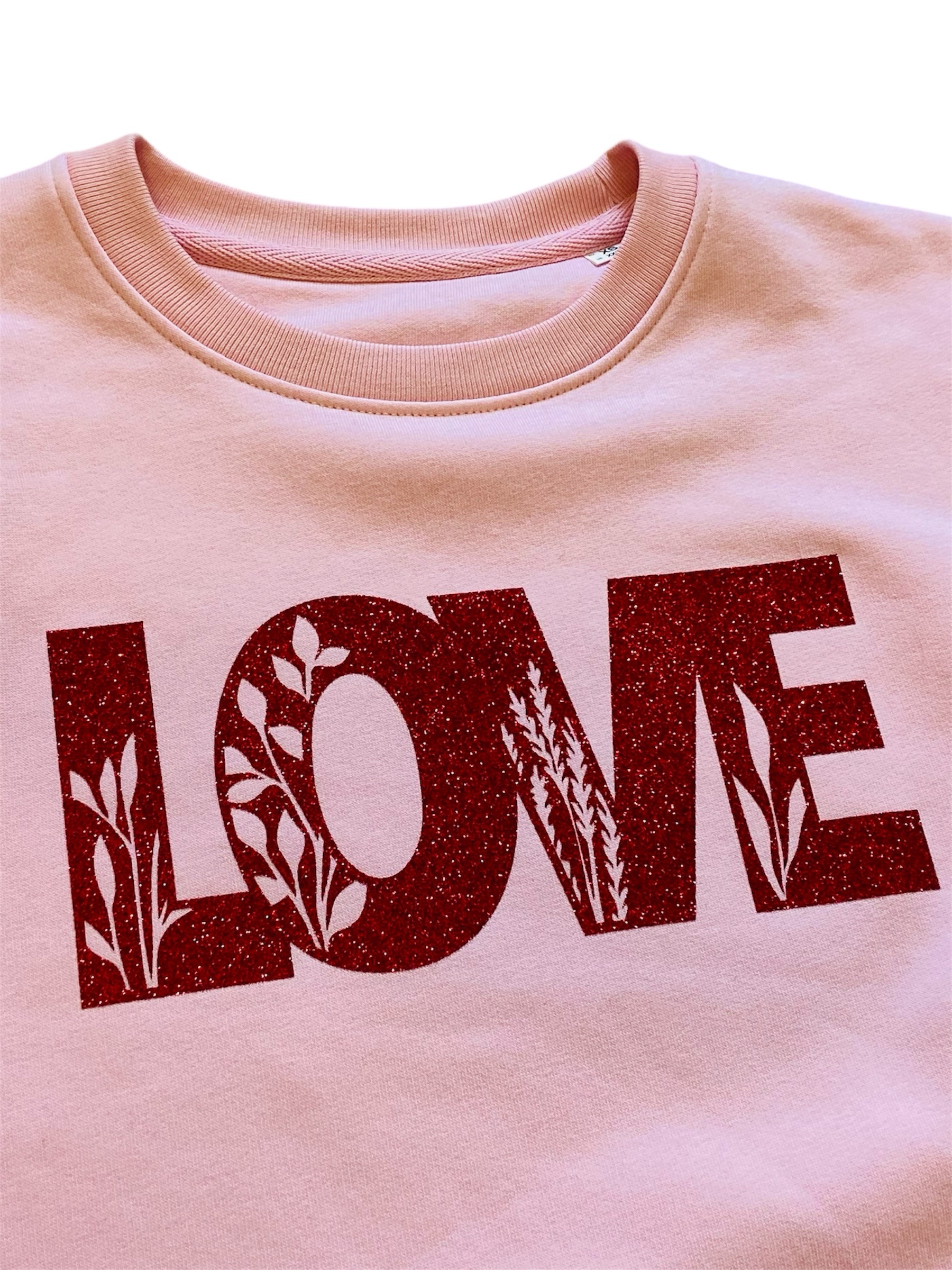 - Motif : LOVE en thermocollant rouge pailleté avec motifs floraux