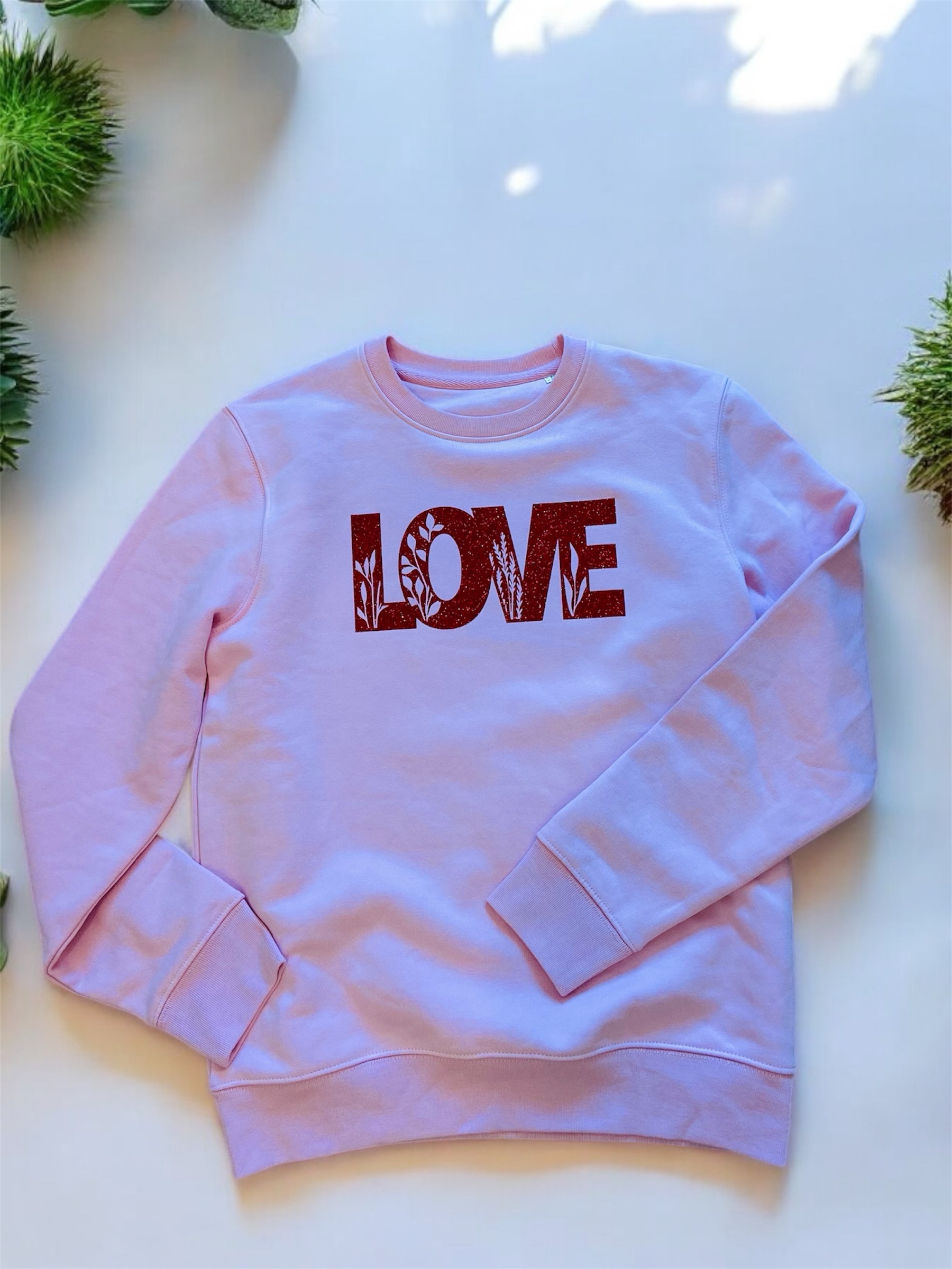 Chez L’Inattendue, on adore proposer des créations originales et réalisées avec soin. Ce pull rose pâle, à la coupe confortable et au tissu tout doux, a été sublimé à la main grâce à un transfert textile en rouge pailleté. Chaque lettre du mot LOVE est ornée de motifs floraux, ajoutant une touche bohème et naturelle à cette pièce lumineuse.