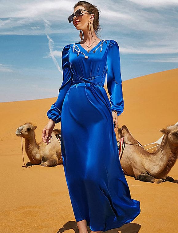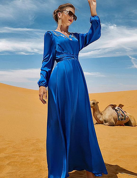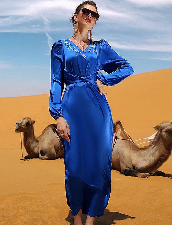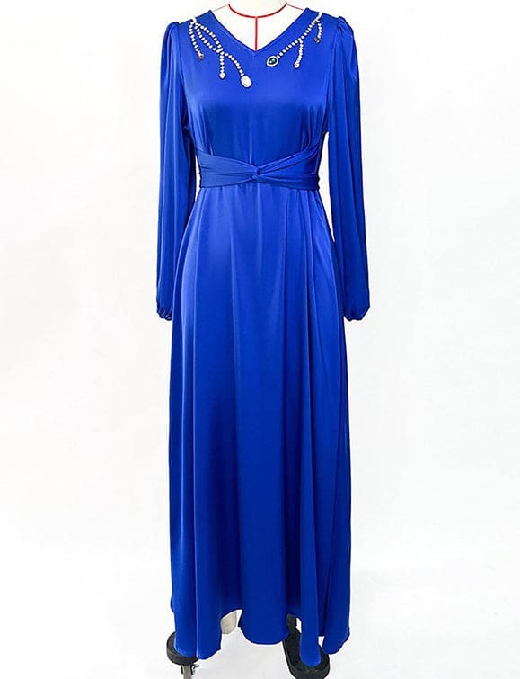 Robe à manches longues avec col en V et strass, bleu royal
