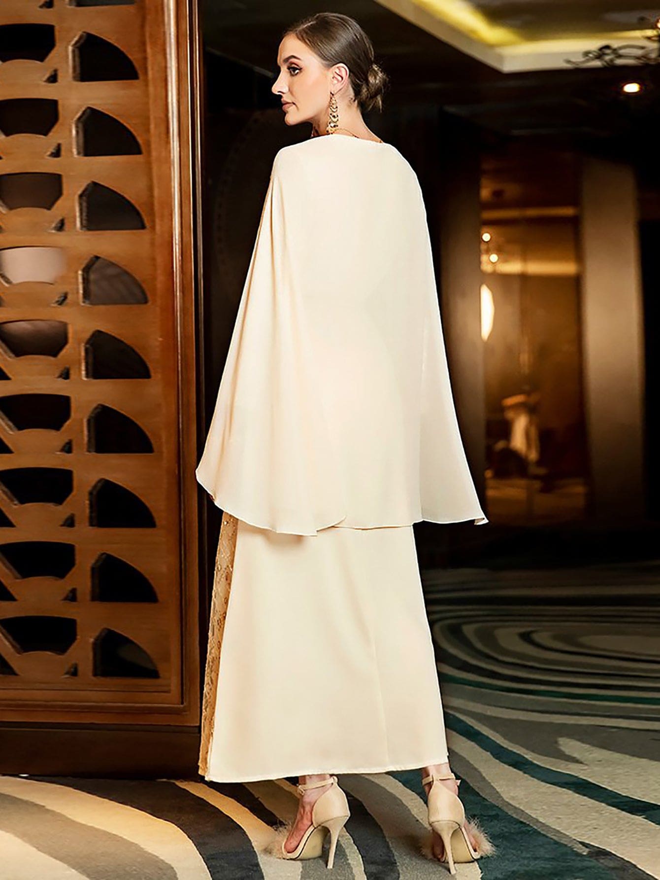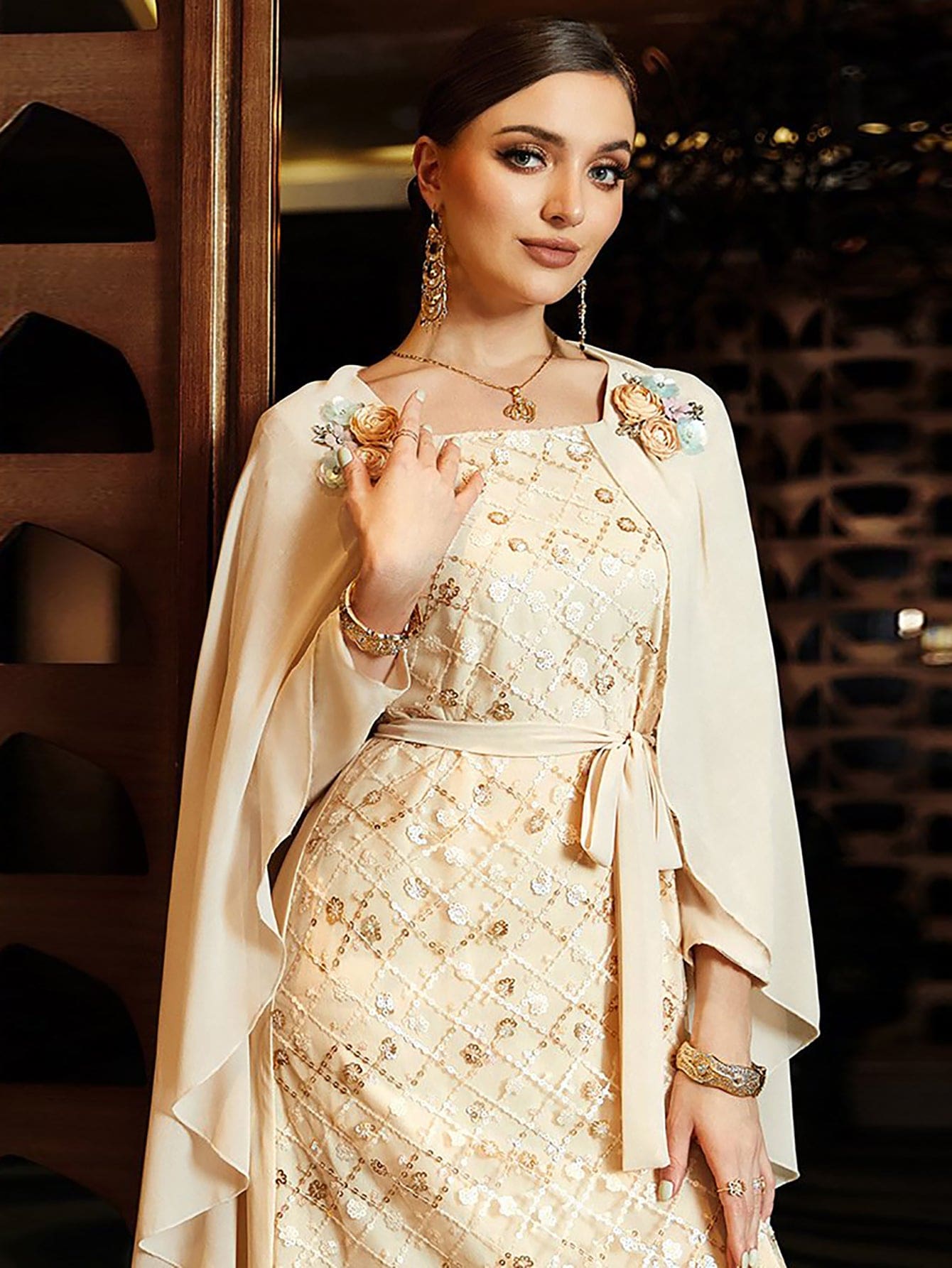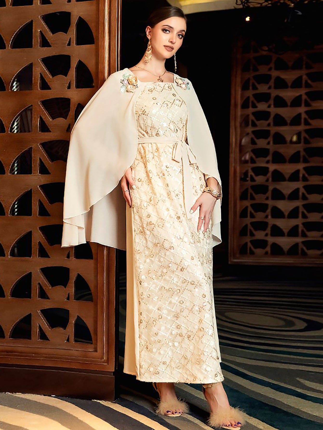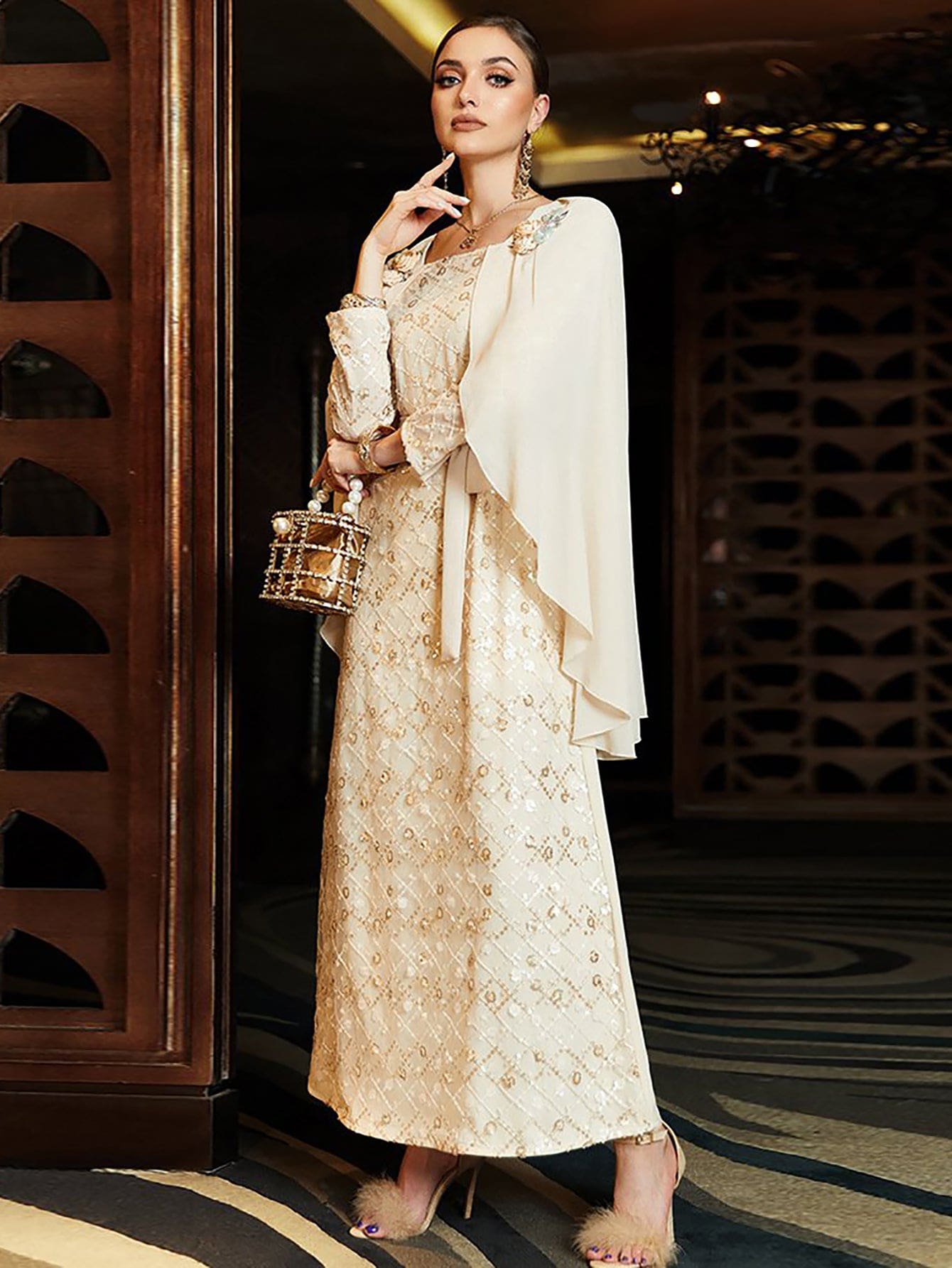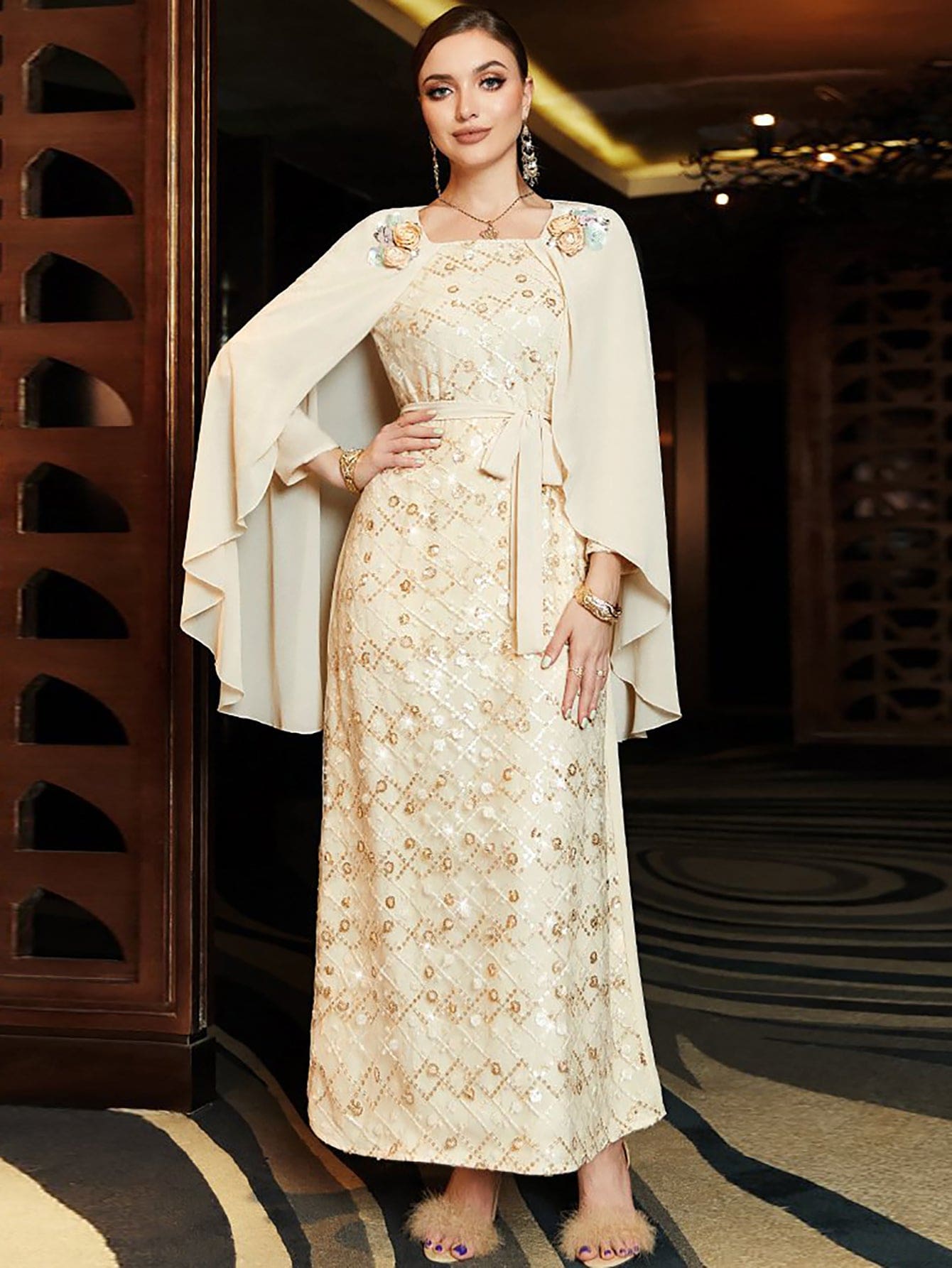 Robe beige à paillettes et strass