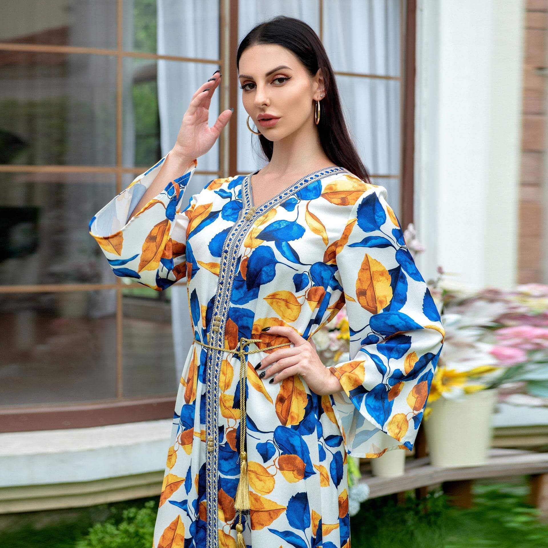 Decorée de motifs bleus et d’un coloris blanc cassé, cette robe est un parfait mélange entre modernité et charme orientale ! Une ceinture dorée est offerte pour l’ajuster à votre taille !