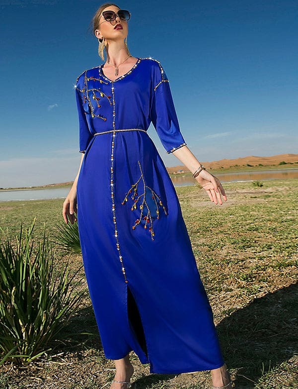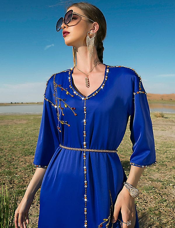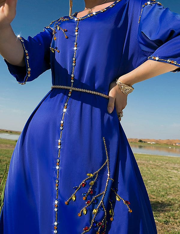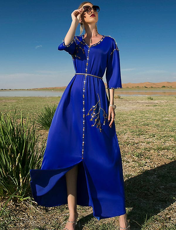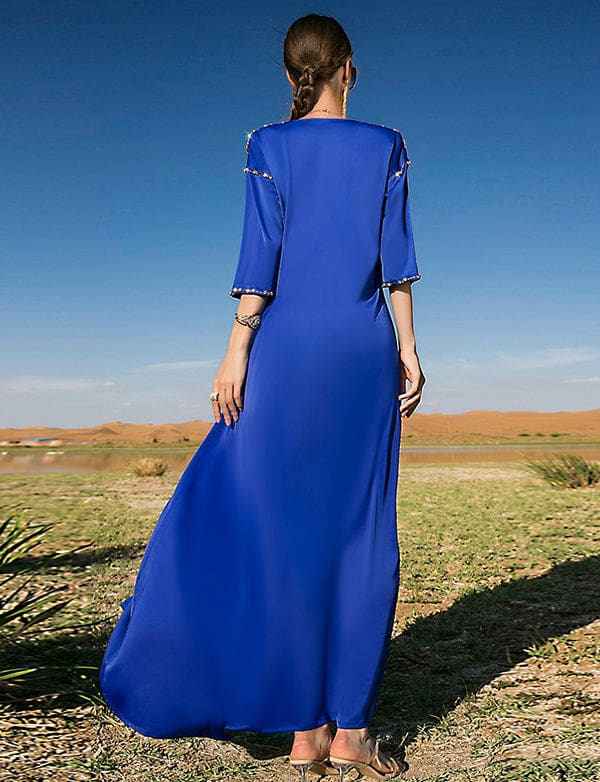 Robe Longue en Satin Bleu Royal à Manches Mi-longues