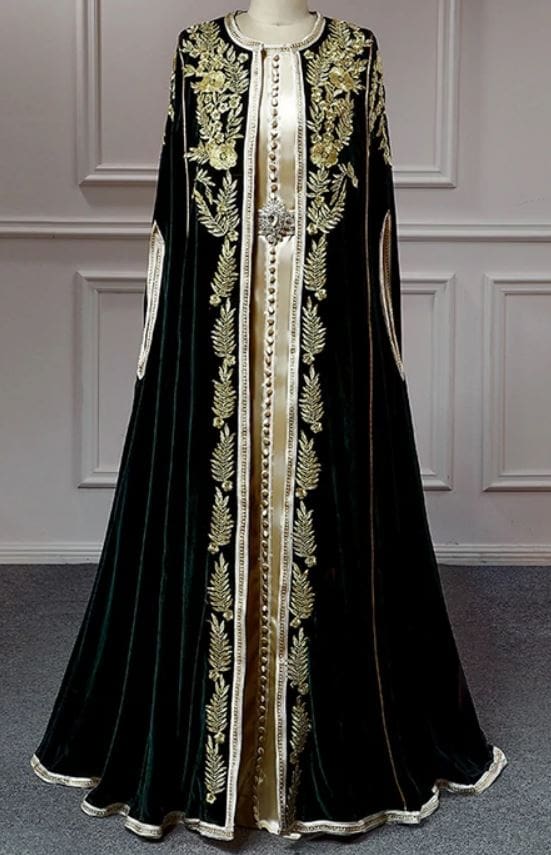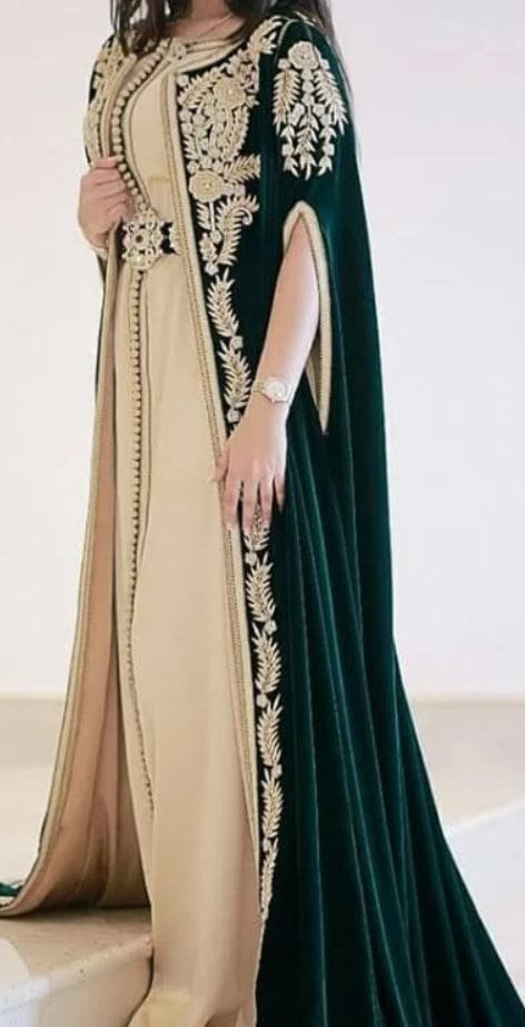 Pour une vraie femme, porté une belle robe maxi sera un atout pour avoir l’élégance. En effet, la Takchita Fadila de couleur beige avec une couleur verte en plus, vous offre l’originalité. Faite en velours avec des motifs uniques, cet habit vous permettra d’être magnifique. Aussi avec sa ceinture intégrée, vos courbes seront mises en valeurs. La ceinture est incluse.