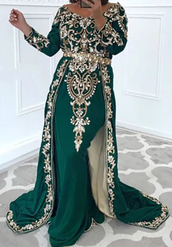 Cherchez-vous LE style parfait qui intègre l’élégance et la perfection ? Optez alors pour la Takchita Mayssa. Une très jolie robe faite en satin de couleur verte et ornée des motifs brillants dorés, elle vous offre un style unique et une touche originale. Aussi, avec sa ceinture intégrée, elle met en valeur votre taille pour le côté plus féminine.