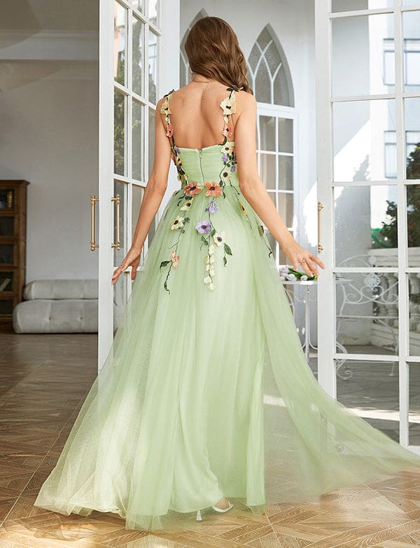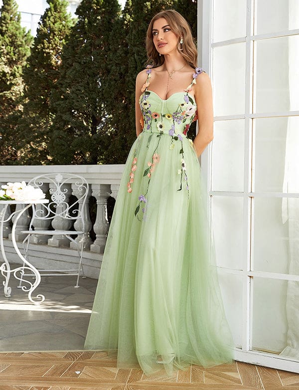 Une ligne Vert bretelles spaghetti robe de bal avec des fleurs 3D